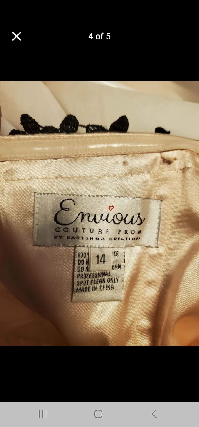 Gorgeous Envious Couture prom dress with a strapless black lace bodice and a flowing peachy-pink tulle skirt. This dress is a size 14 and perfect for any formal occasion. It's made with 100% polyester for a comfortable fit.