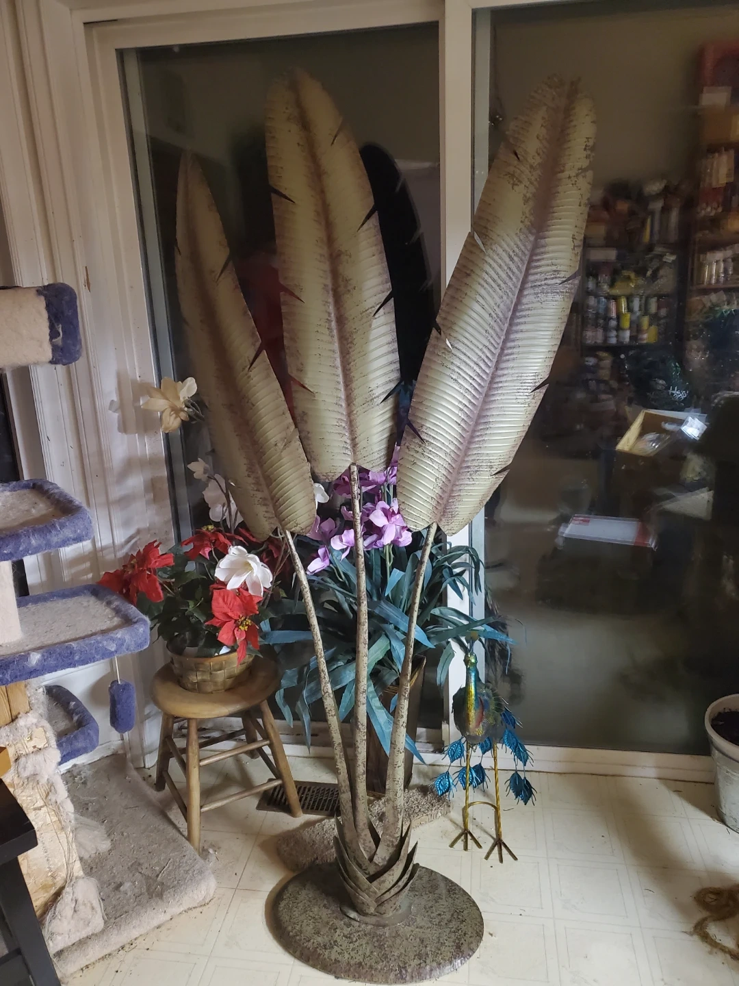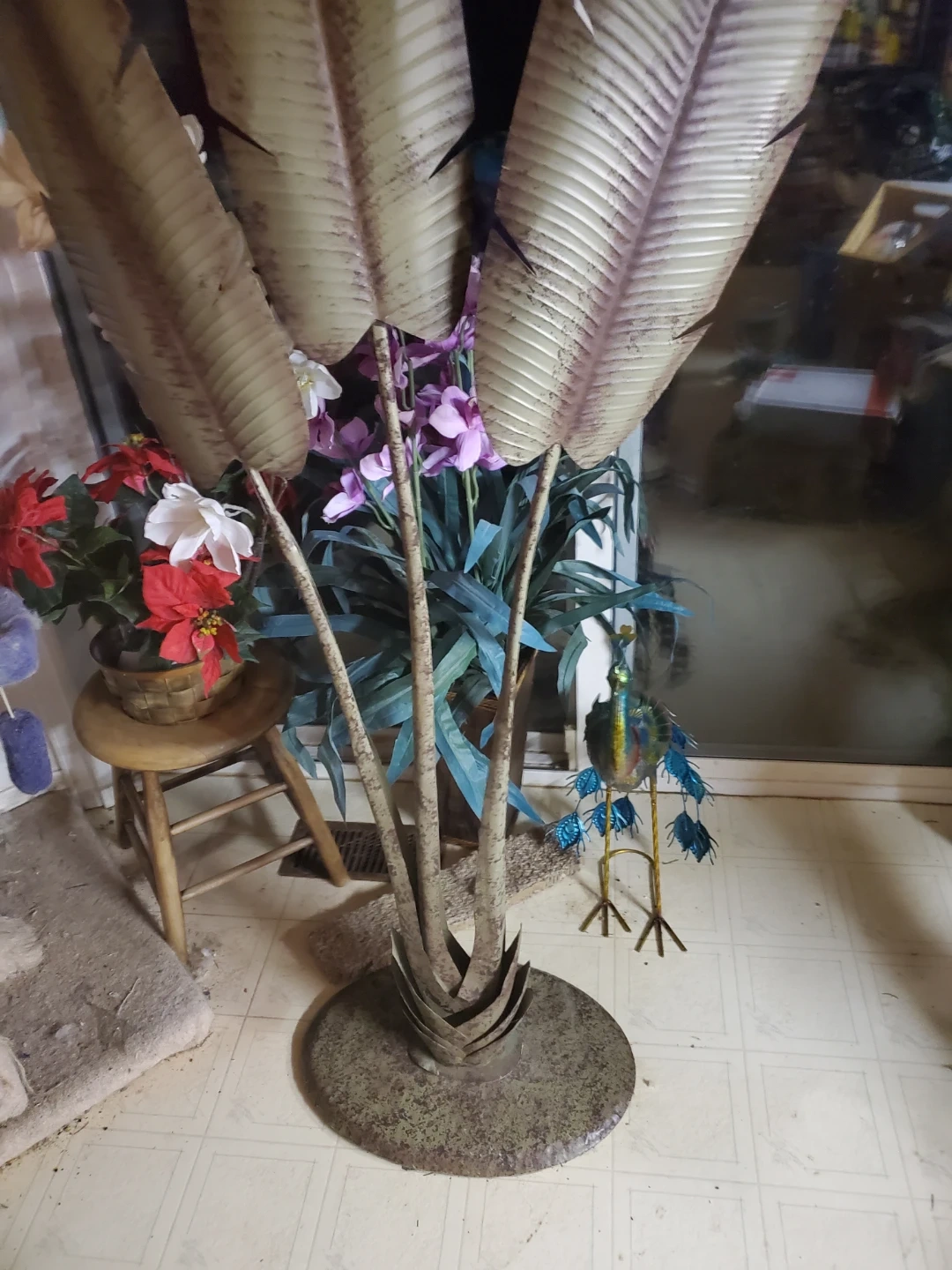 This is a decorative metal sculpture featuring large tropical leaves. It has a sturdy base and a rustic finish. Its size makes it a statement piece for any room. It's almost as tall as the sliding door window in height. 5 feet.