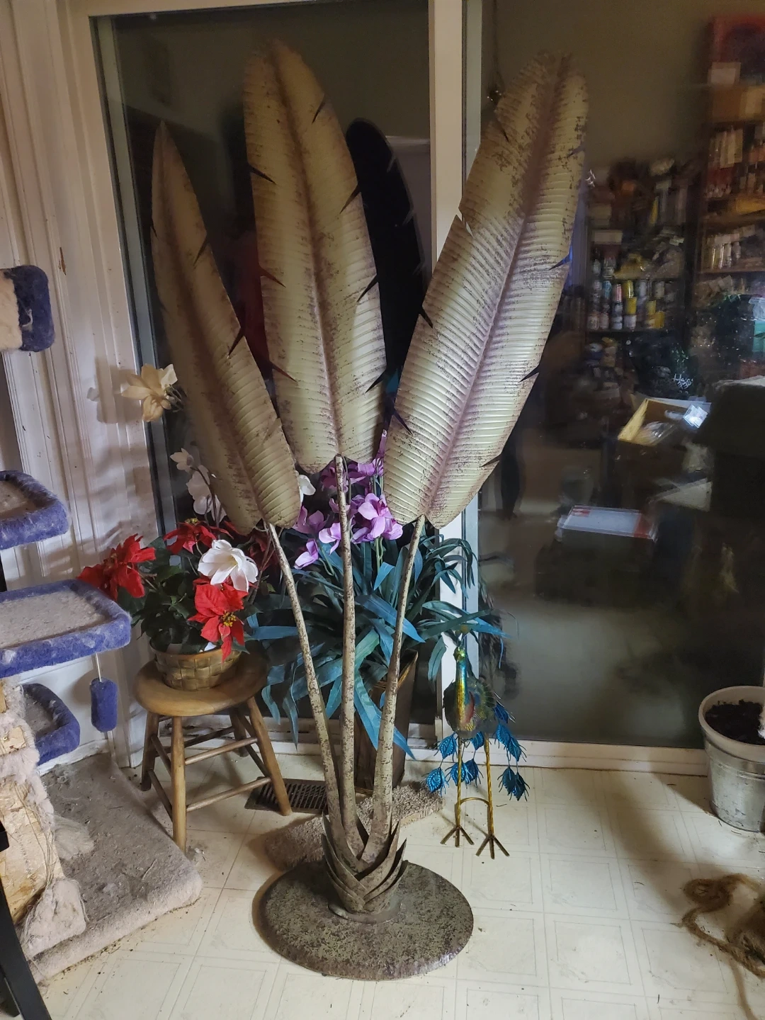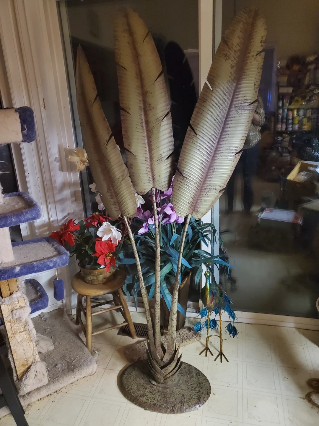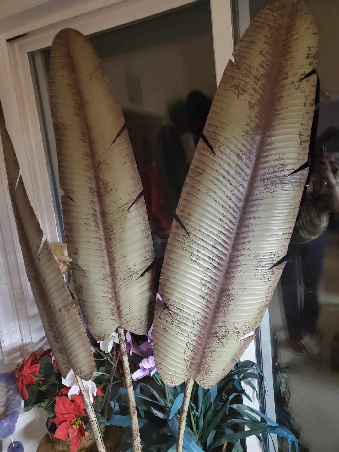 This is a decorative metal sculpture featuring large tropical leaves. It has a sturdy base and a rustic finish. Its size makes it a statement piece for any room. It's almost as tall as the sliding door window in height. 5 feet.