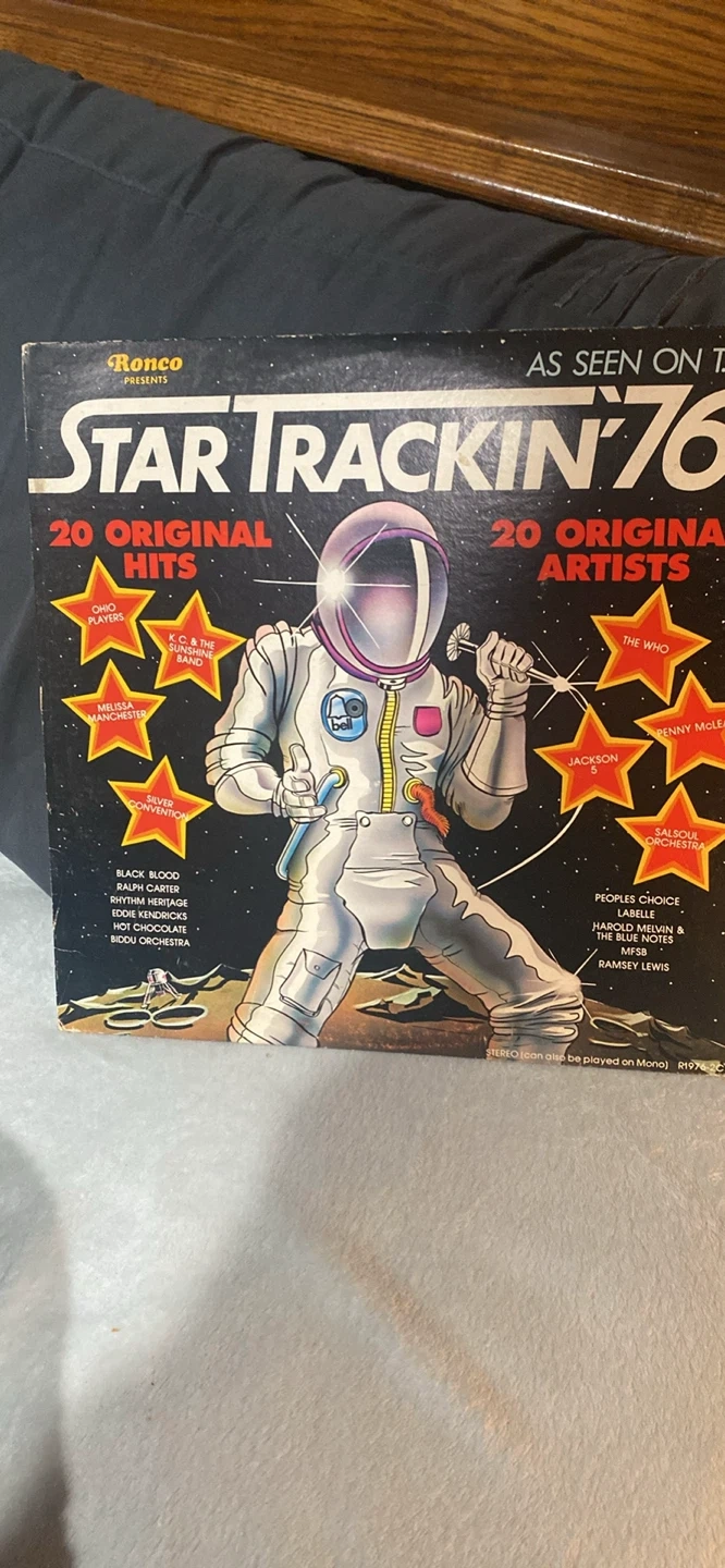 This is the Star Trackin' '76 vinyl record album. It features 20 original hits and 20 original artists. Includes tracks by Biddu Orchestra, Jackson, and The Who.