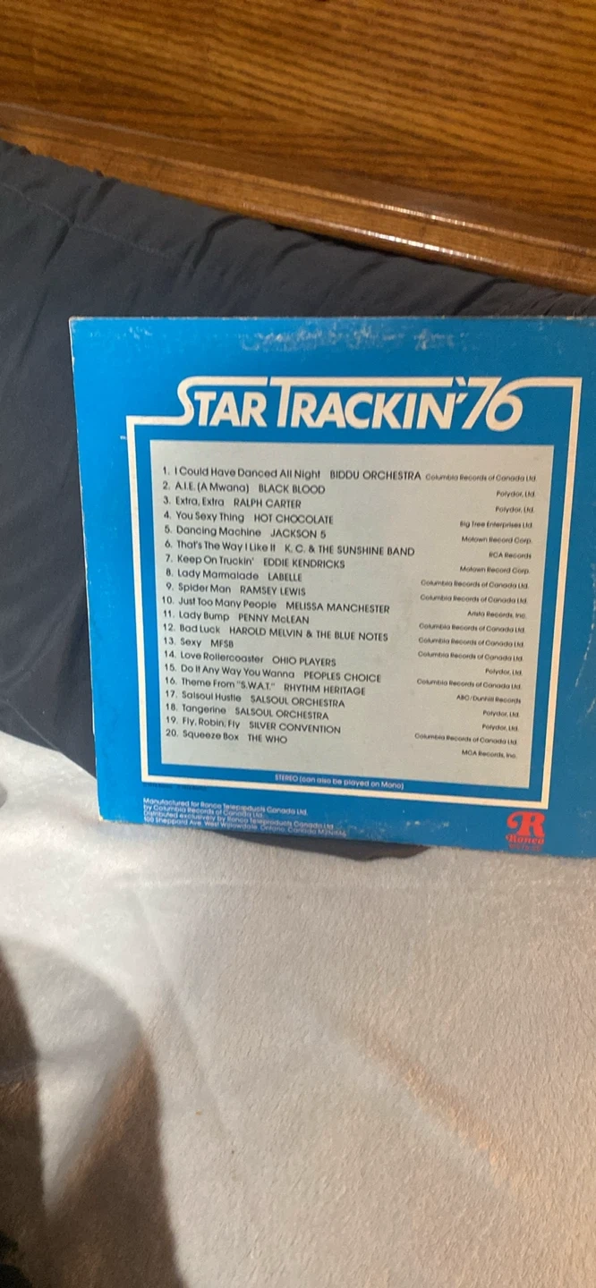 This is the Star Trackin' '76 vinyl record album. It features 20 original hits and 20 original artists. Includes tracks by Biddu Orchestra, Jackson, and The Who.