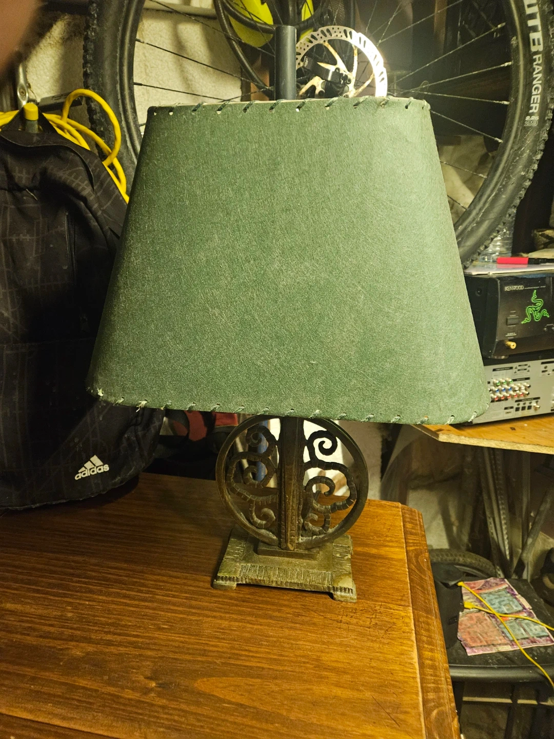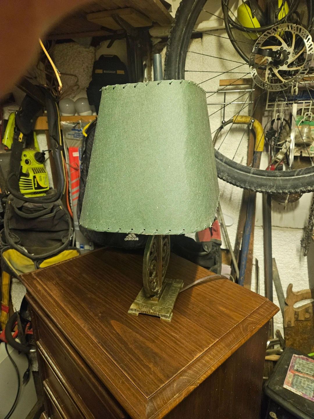 This vintage desk lamp features a textured green lampshade with decorative stitching. Its metal base has an ornate, circular cutout design. A unique accent piece for any room!