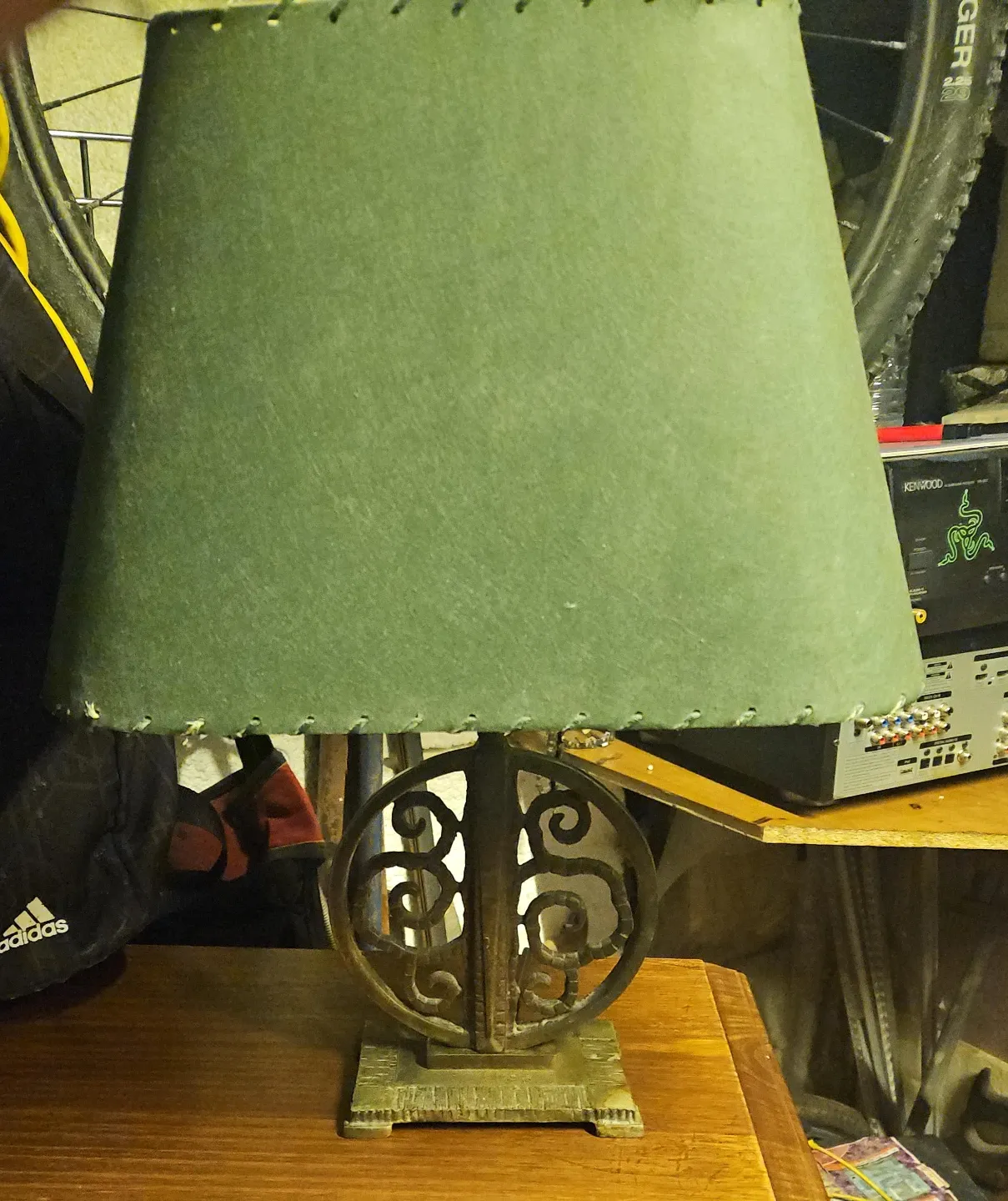 This vintage desk lamp features a textured green lampshade with decorative stitching. Its metal base has an ornate, circular cutout design. A unique accent piece for any room!