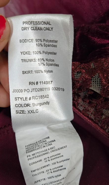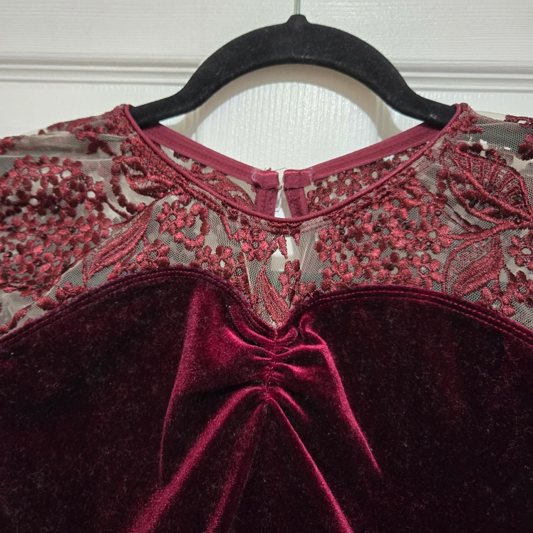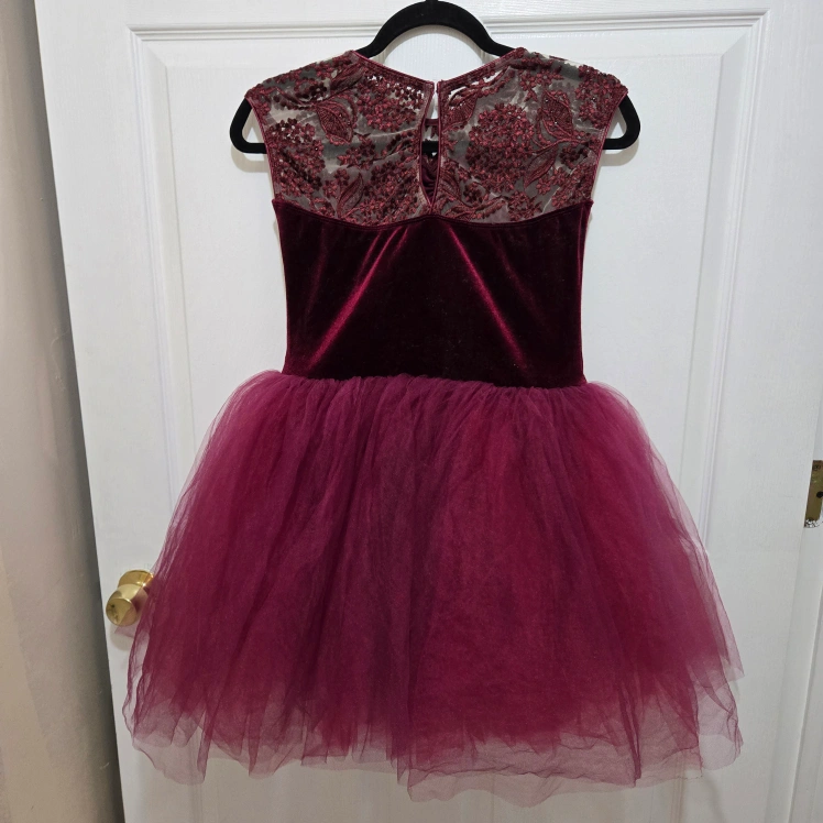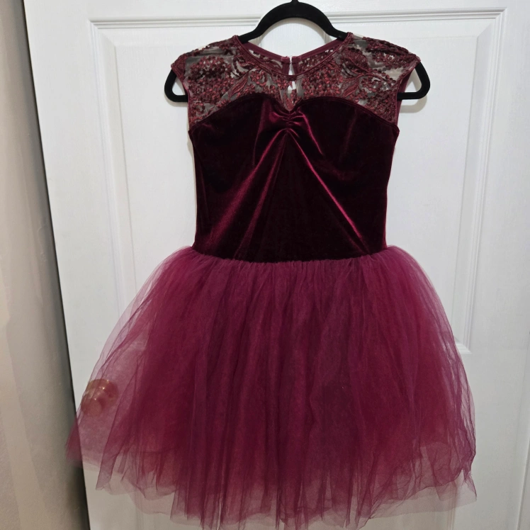 This pre-owned Revolution Burgundy Velvet Leotard is a luxurious and stylish dancewear outfit for women. Made by Revolution Dancewear, this XXL leotard features a burgundy color with a velvet top material for a soft and comfortable feel and a floral lace chest area. The attached tutu top adds a touch of elegance, while the hair comb clip add a personalized and unique touch to the overall design. Perfect for dance performances, special occasions, or as a party custome.
