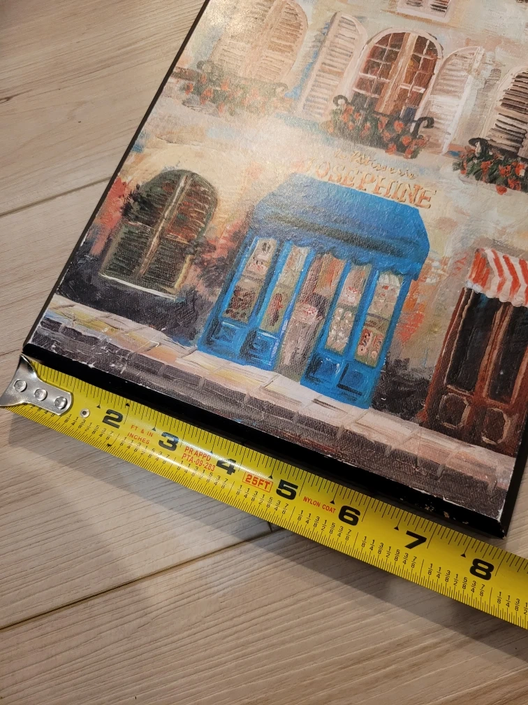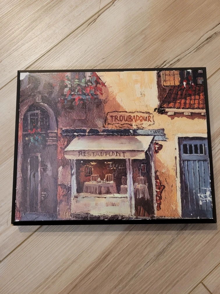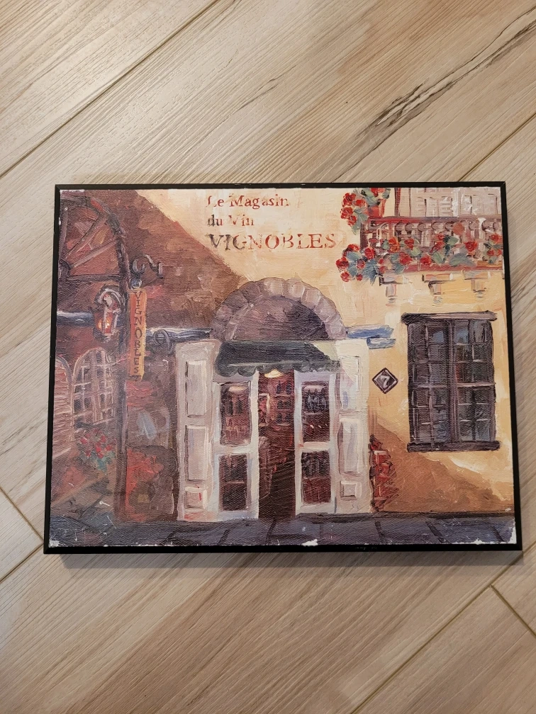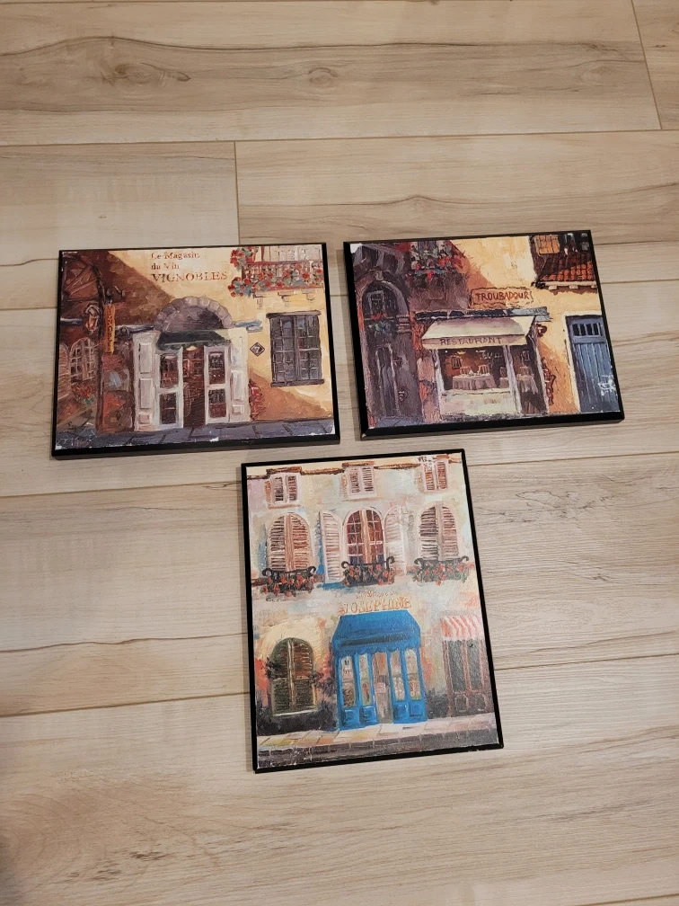 Selling a set of three wall art pieces featuring charming French cityscapes. All three together for price. These pieces add a touch of vintage elegance to any room. Please note that there are some descripencies as shown in the pictures around edges of the art, but it adds to the worn look.
