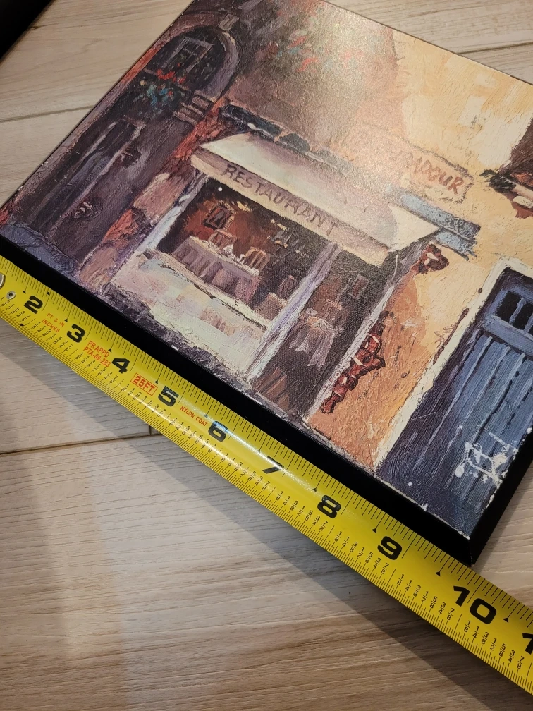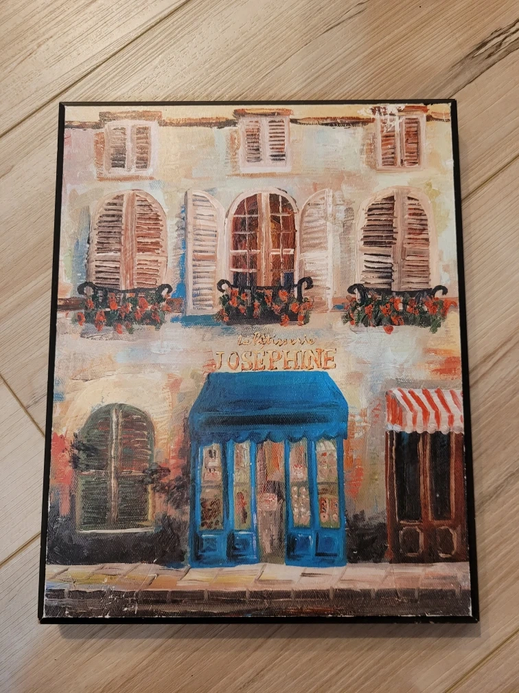 Selling a set of three wall art pieces featuring charming French cityscapes. All three together for price. These pieces add a touch of vintage elegance to any room. Please note that there are some descripencies as shown in the pictures around edges of the art, but it adds to the worn look.