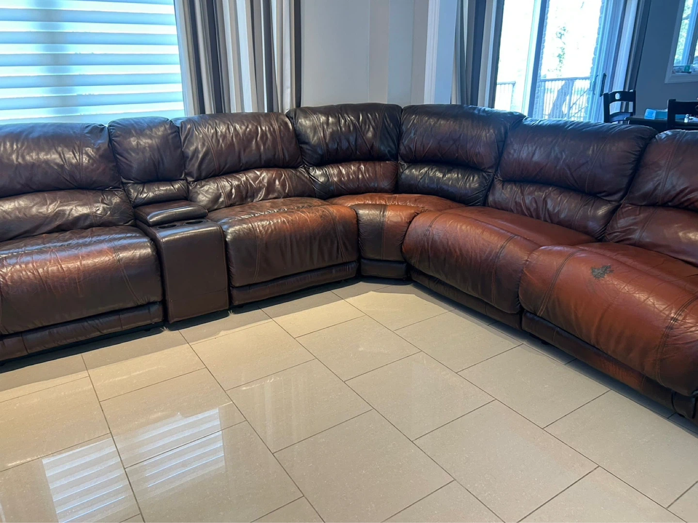 This is a brown leather reclining sectional sofa. It's a corner unit with multiple seating sections and a built-in cup holder console. Plenty of space for the whole family to get comfy!