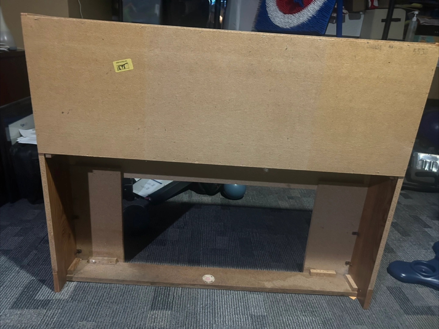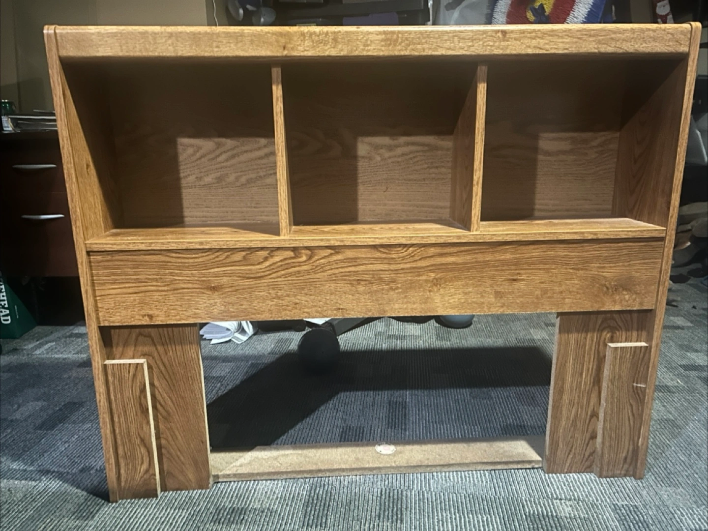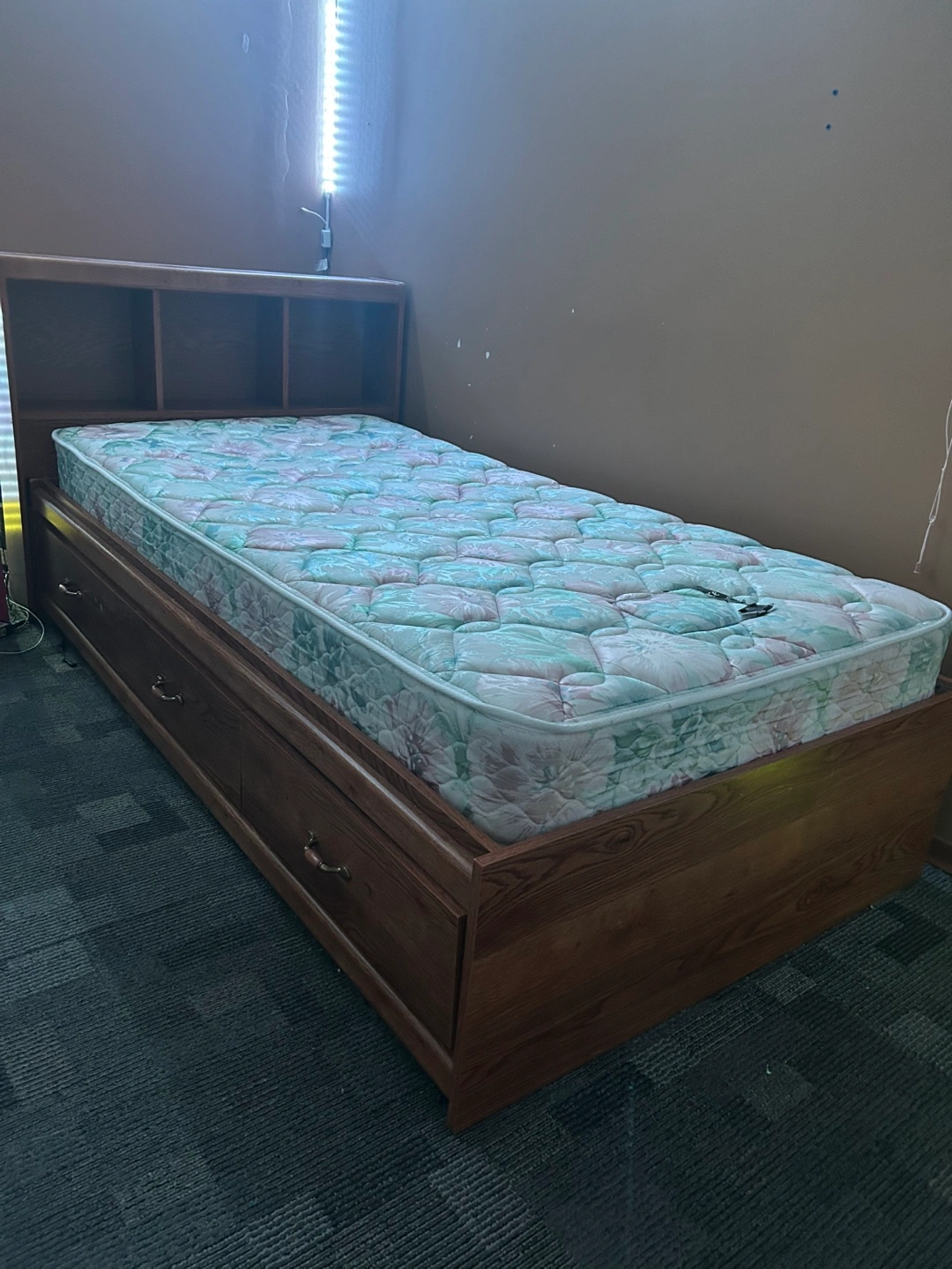 Selling a wooden single bed frame that comes with built-in storage drawers underneath. Also includes a matching desk hutch, perfect for a kid's room or small space. The hutch has shelves and a desk area with additional storage. It has some wear and tear, but still in good condition and very functional. Mattress and headboard included. Pickup only. Want to get rid as soon as possible.