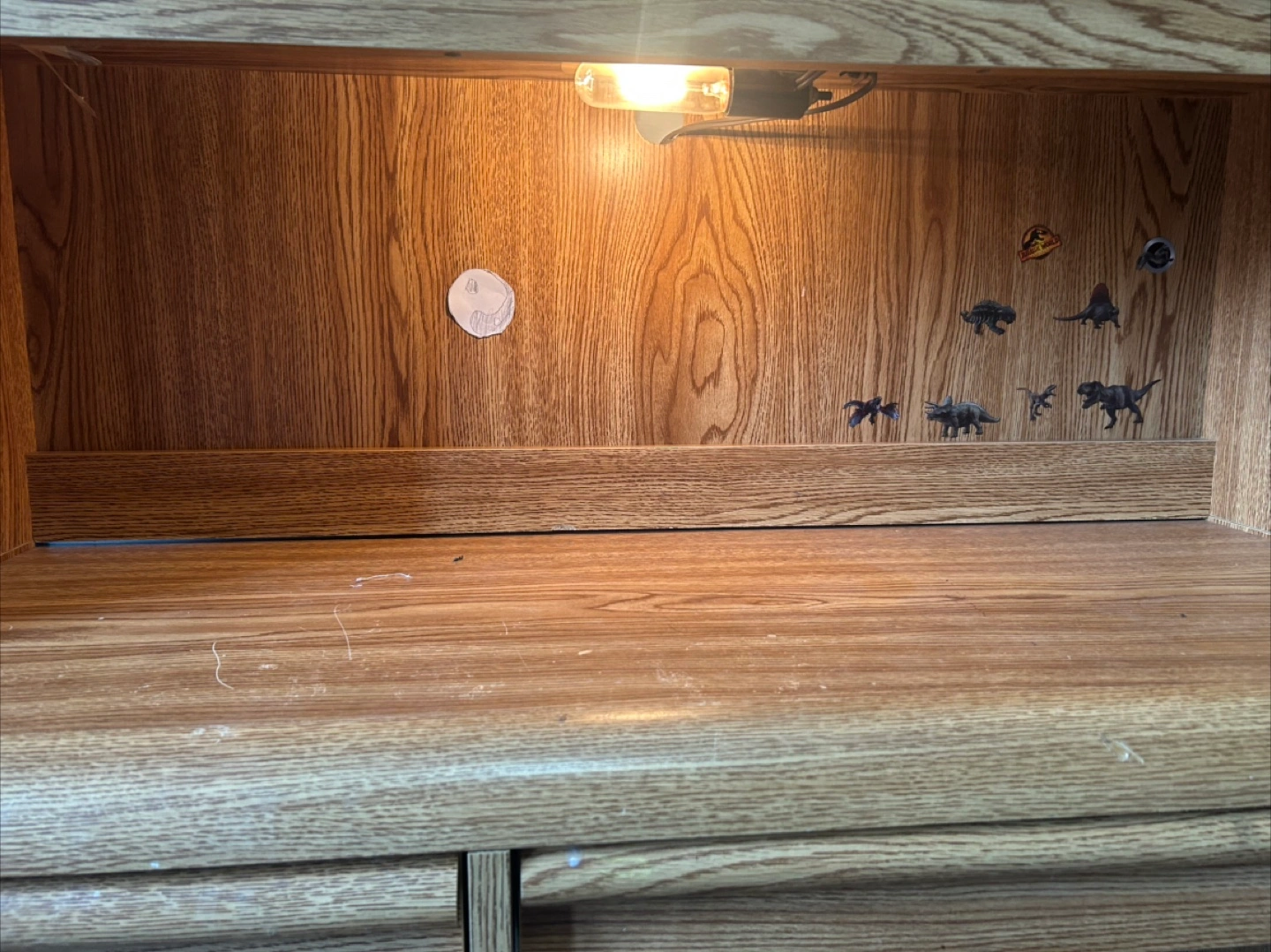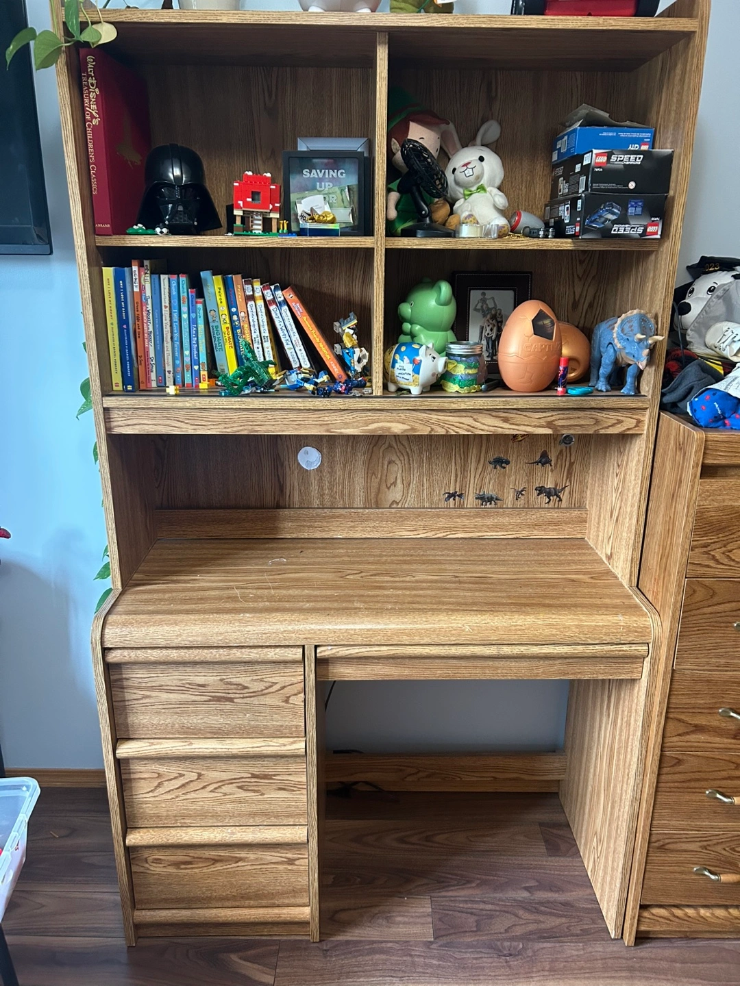 Selling a wooden single bed frame that comes with built-in storage drawers underneath. Also includes a matching desk hutch, perfect for a kid's room or small space. The hutch has shelves and a desk area with additional storage. It has some wear and tear, but still in good condition and very functional. Mattress and headboard included. Pickup only. Want to get rid as soon as possible.