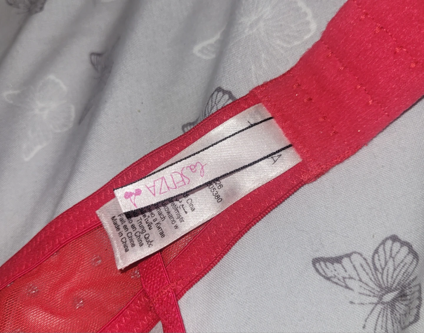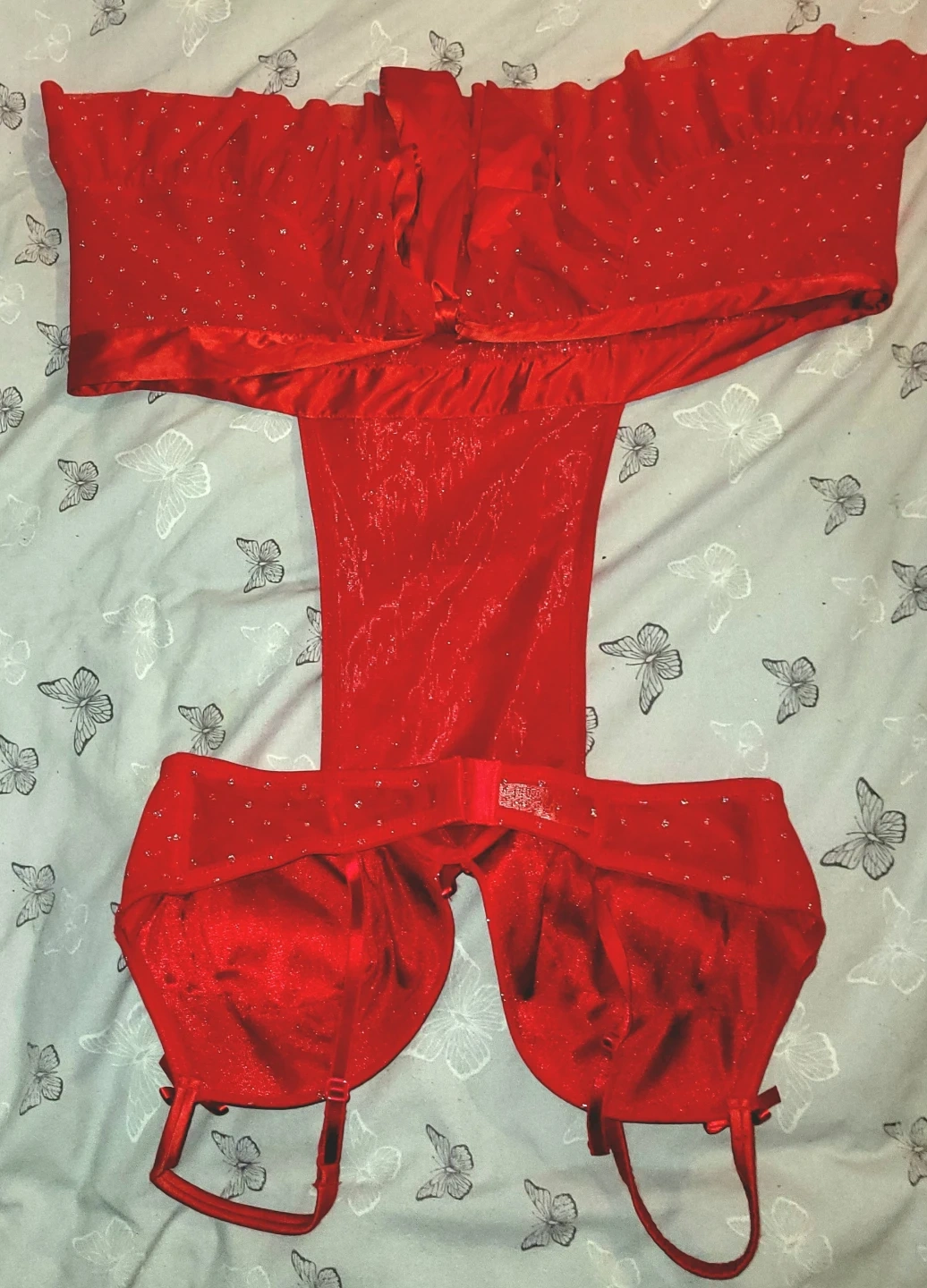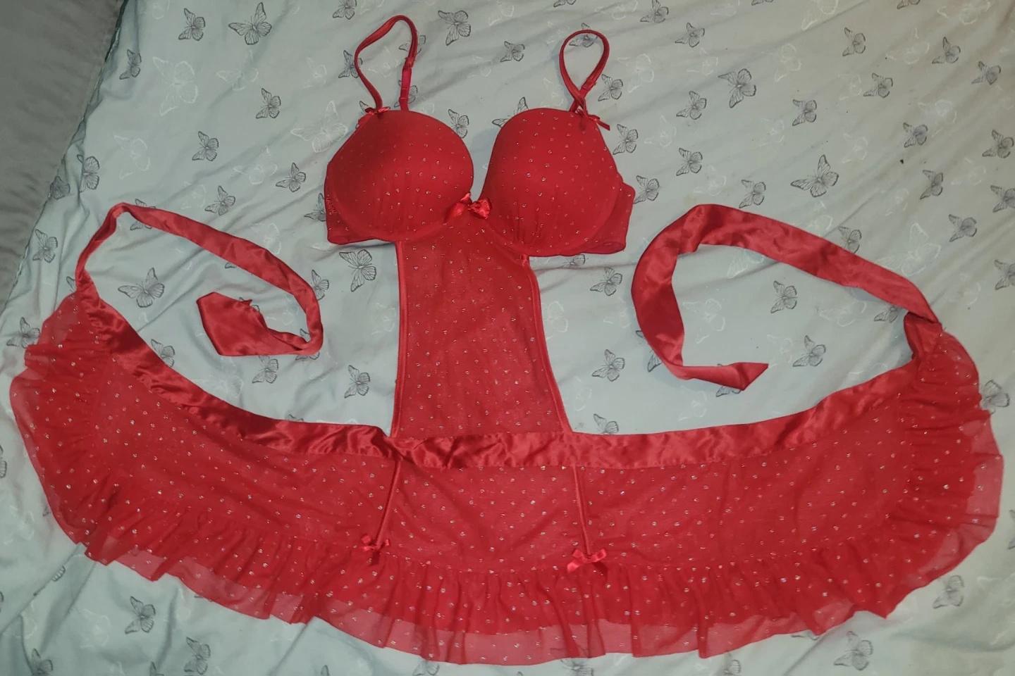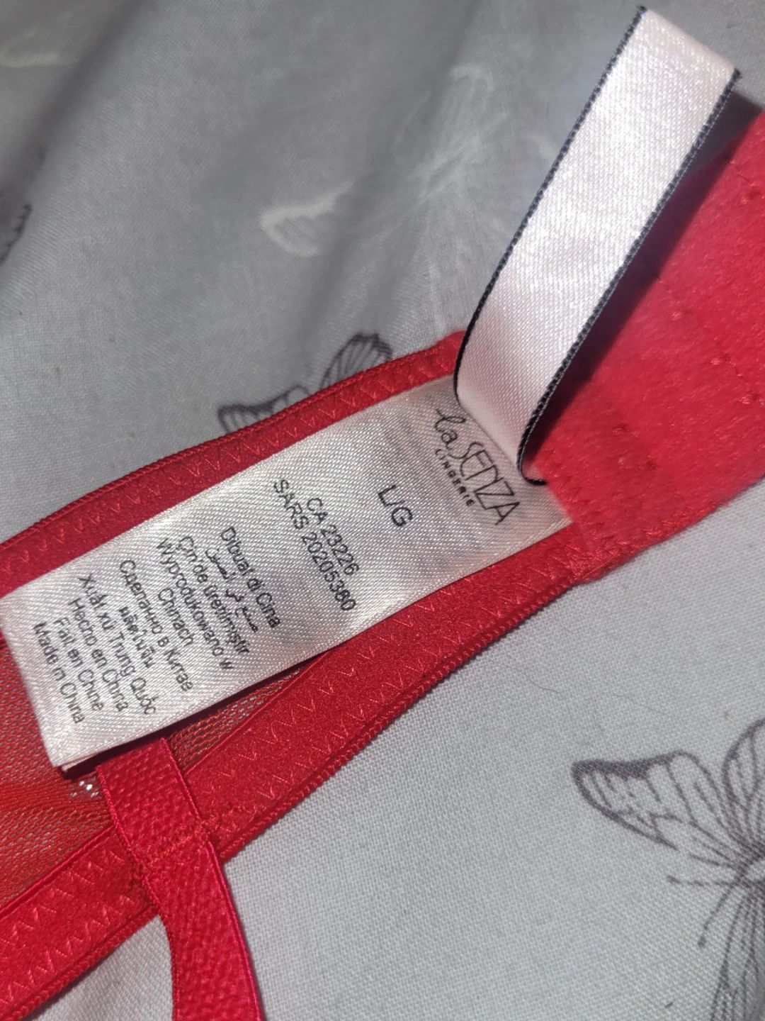 This red lingerie set from La Senza includes a bra and garter belt with a sparkle detail. The bra is size LG and the set has a festive look. It's a pretty addition to any lingerie collection!