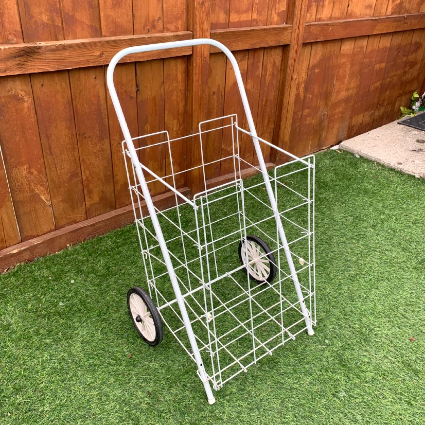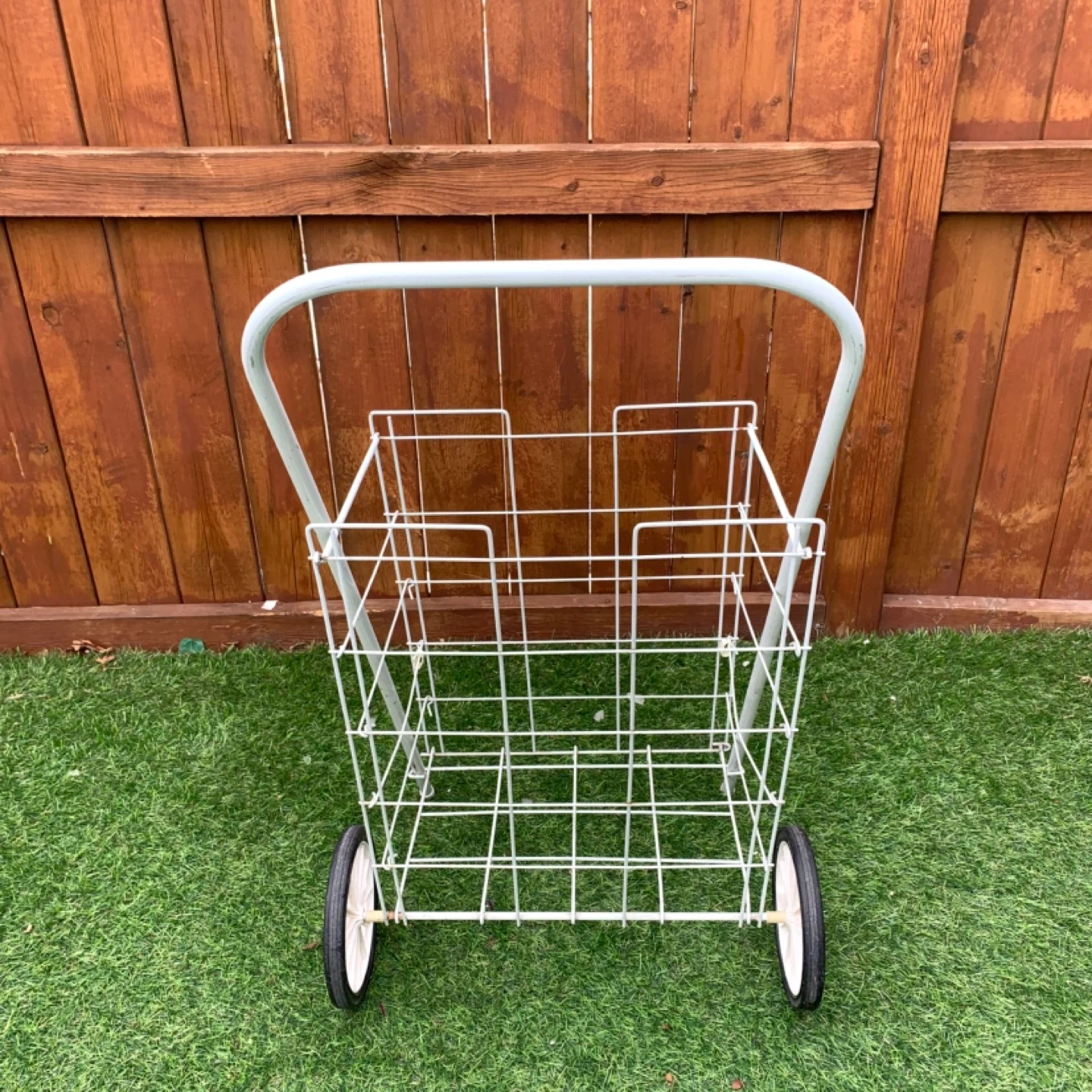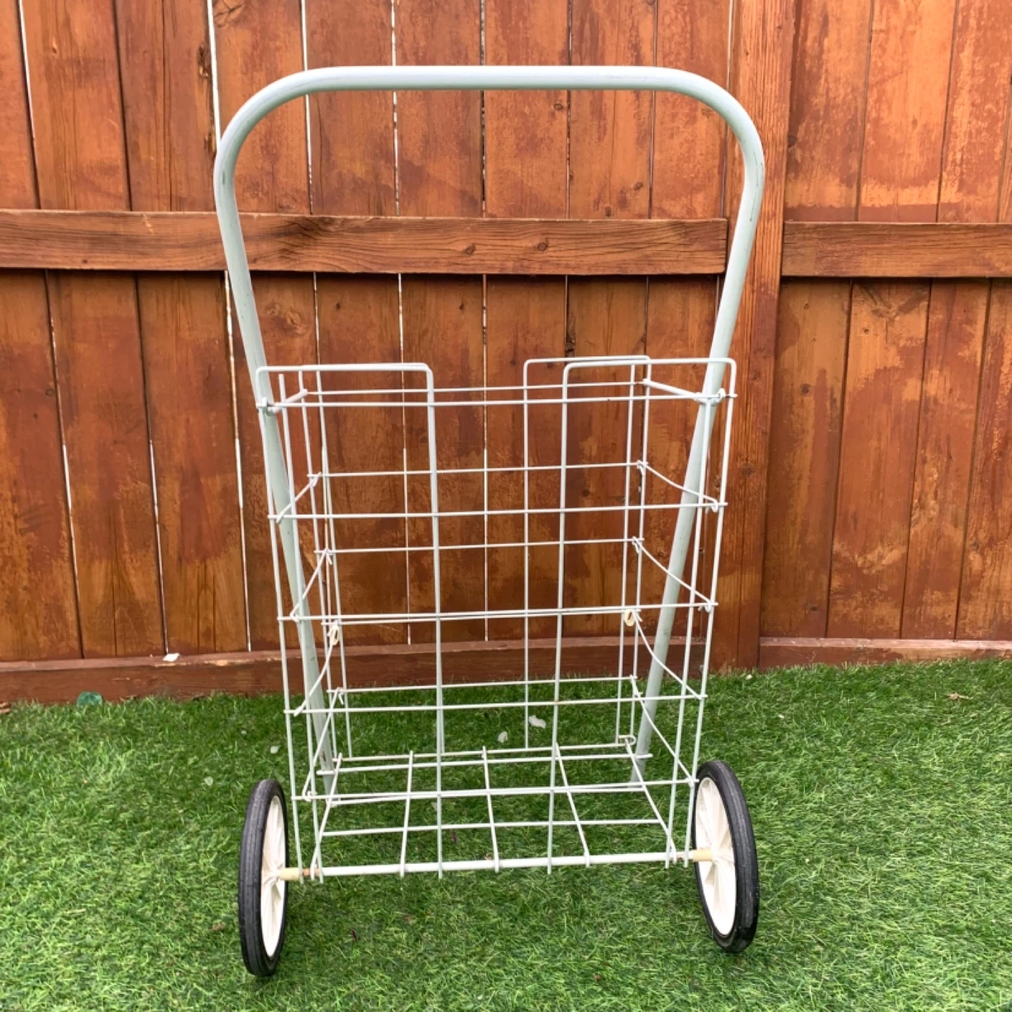 Shopping cart wire utility cart rolling design perfect for groceries, laundry, or everyday transport. White metal frame with two wheels makes it easy to move items without heavy lifting, ideal for home, apartment, or errands. Lightweight yet sturdy for practical daily use.