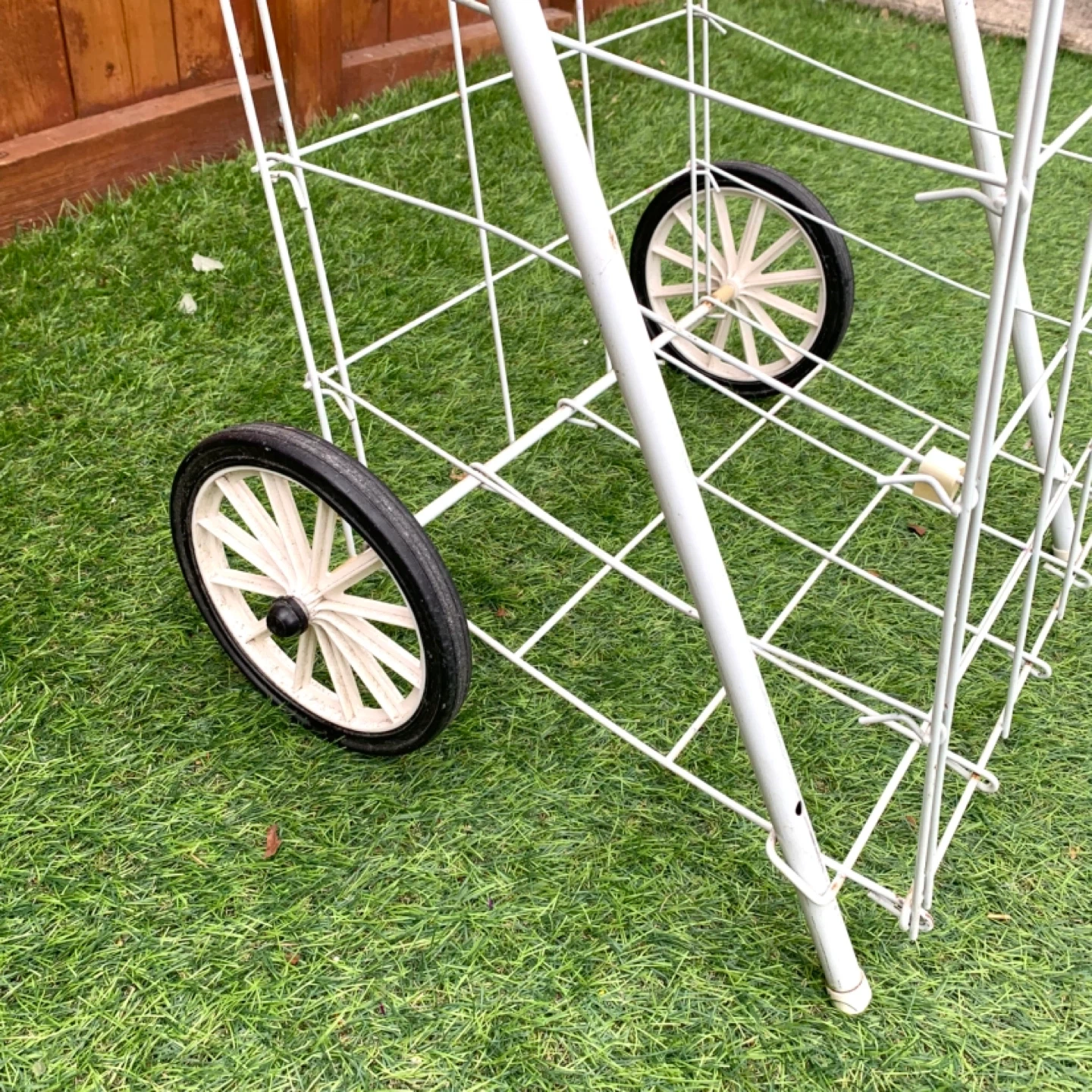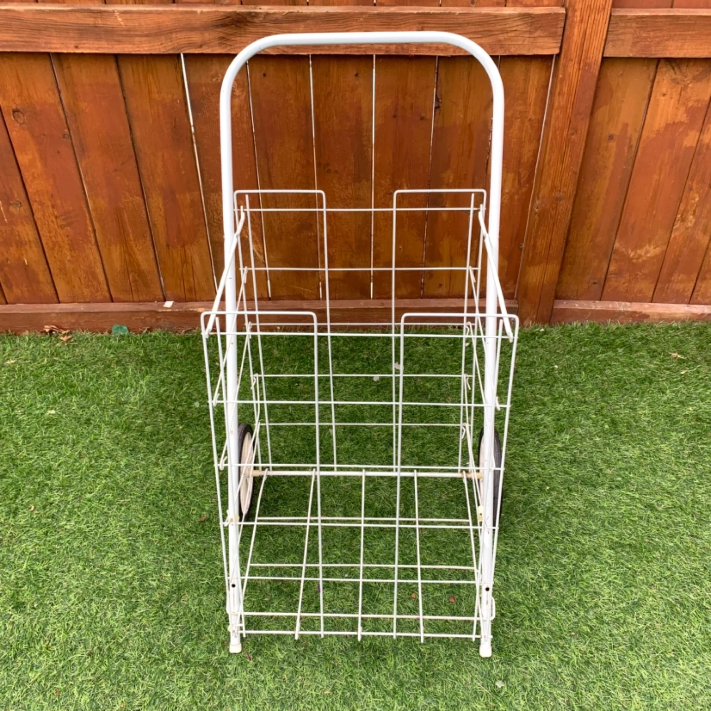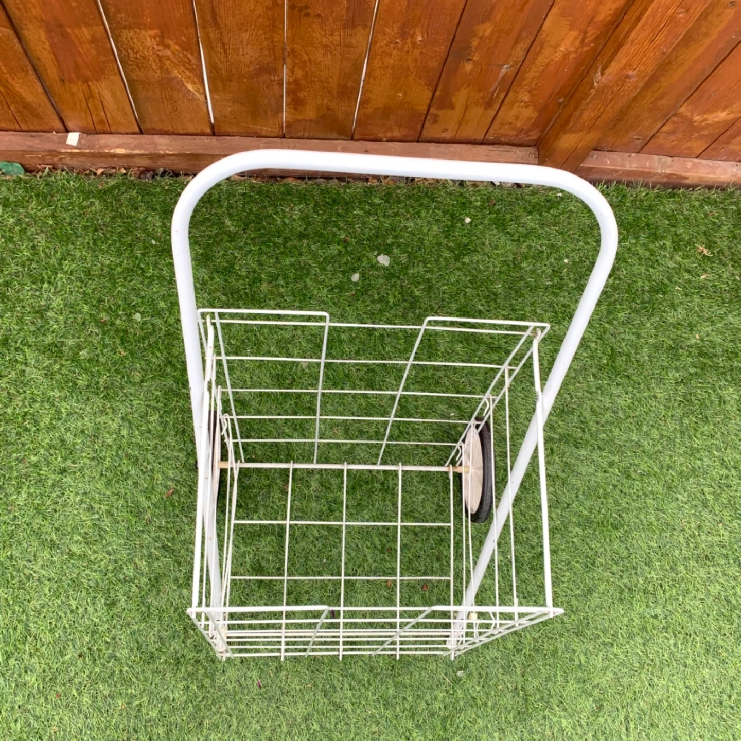 Shopping cart wire utility cart rolling design perfect for groceries, laundry, or everyday transport. White metal frame with two wheels makes it easy to move items without heavy lifting, ideal for home, apartment, or errands. Lightweight yet sturdy for practical daily use.