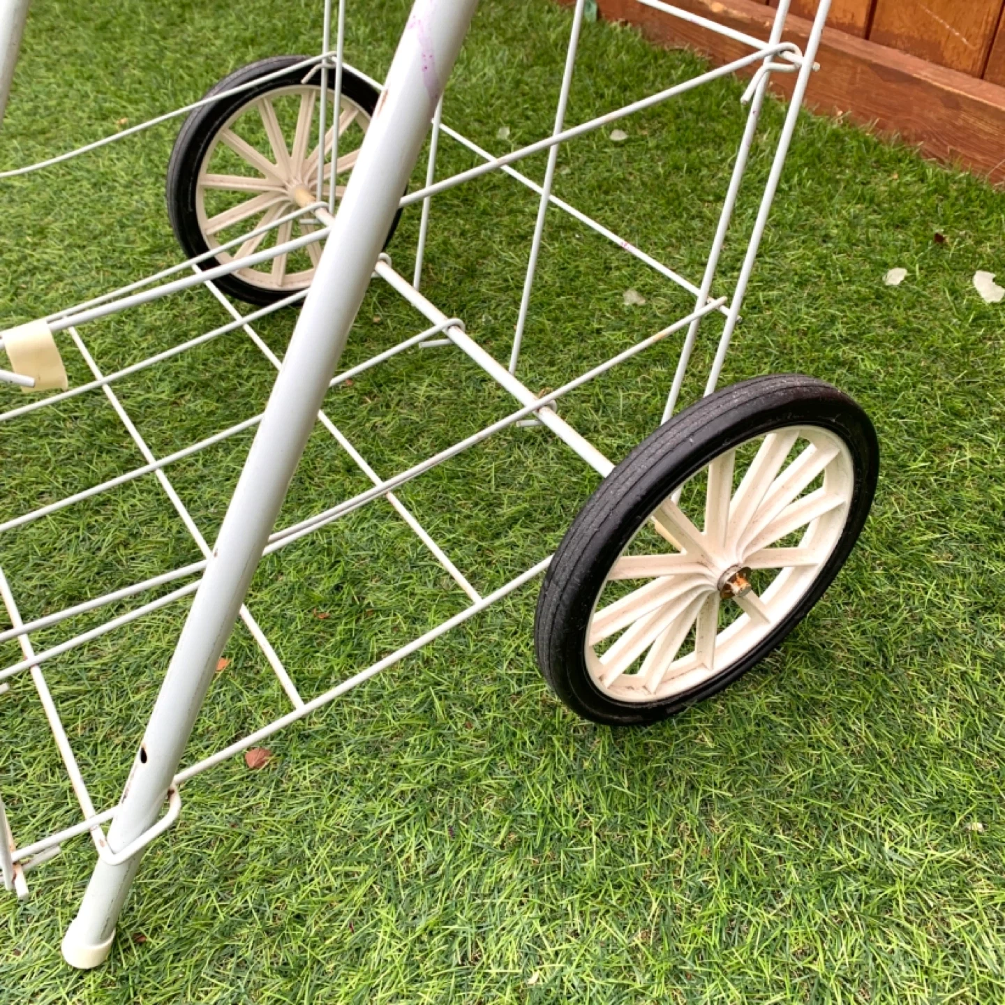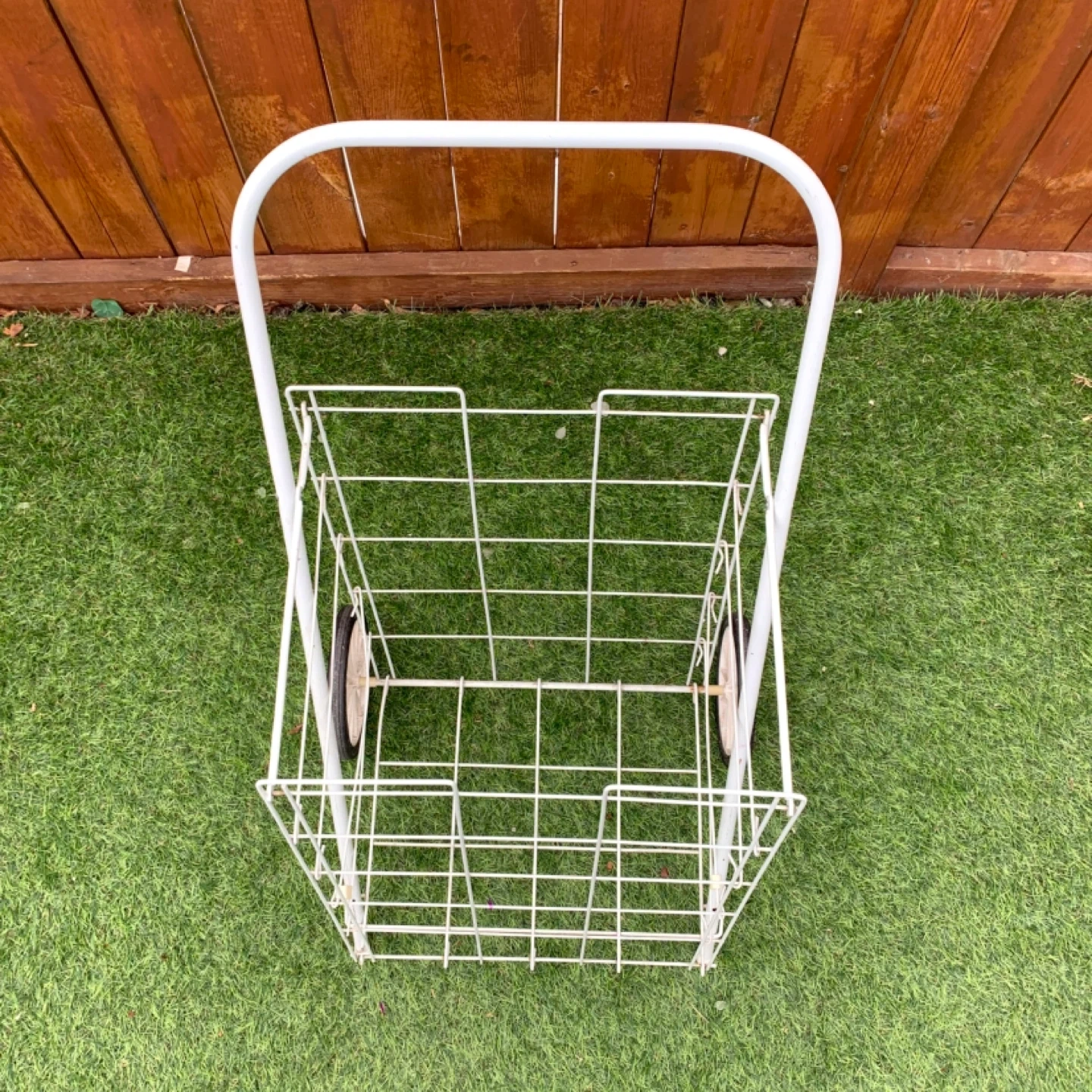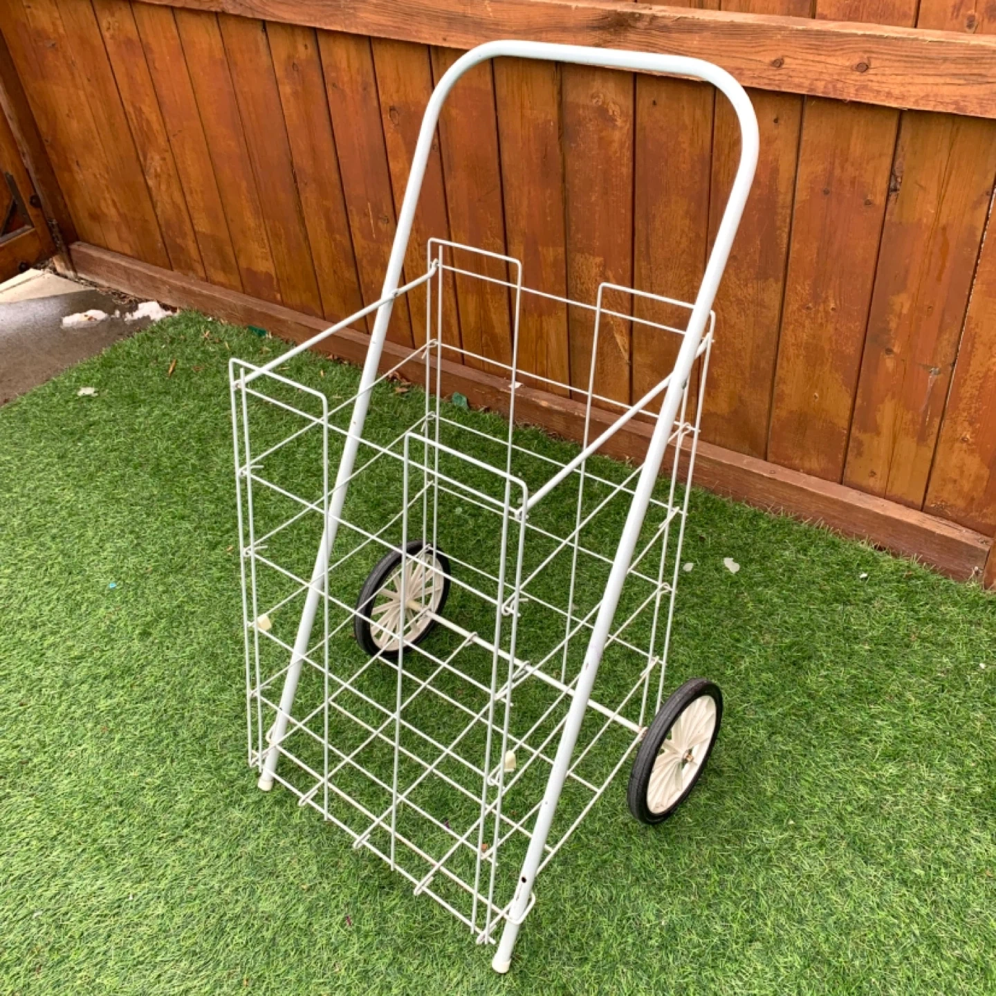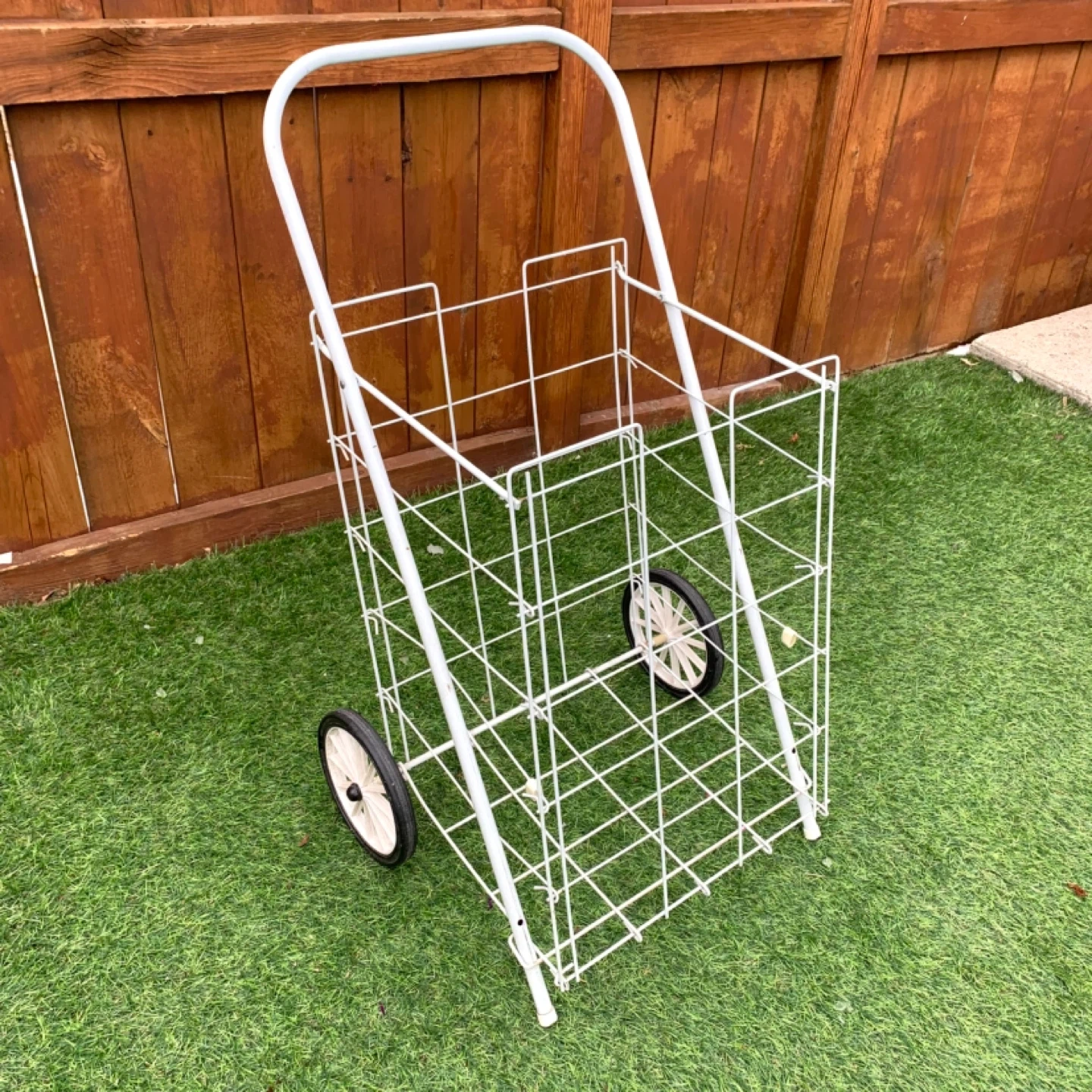 Shopping cart wire utility cart rolling design perfect for groceries, laundry, or everyday transport. White metal frame with two wheels makes it easy to move items without heavy lifting, ideal for home, apartment, or errands. Lightweight yet sturdy for practical daily use.