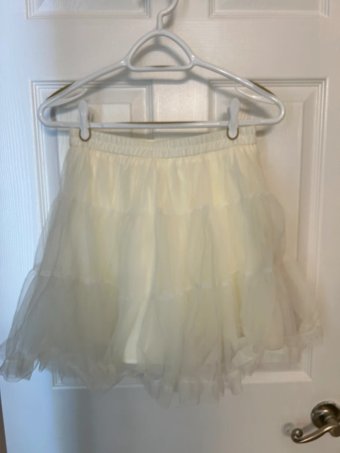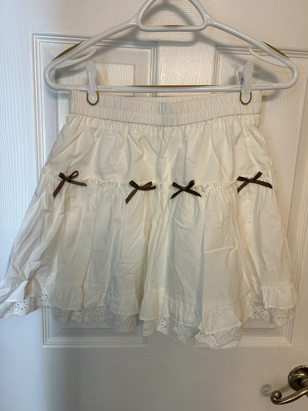 Sweet white skirt with a tiered ruffle design. One with small brown bows and one with a lace trim at the hem. The waistband is elastic for a comfy fit. Perfect for parties or dress-up play! Two for $10.