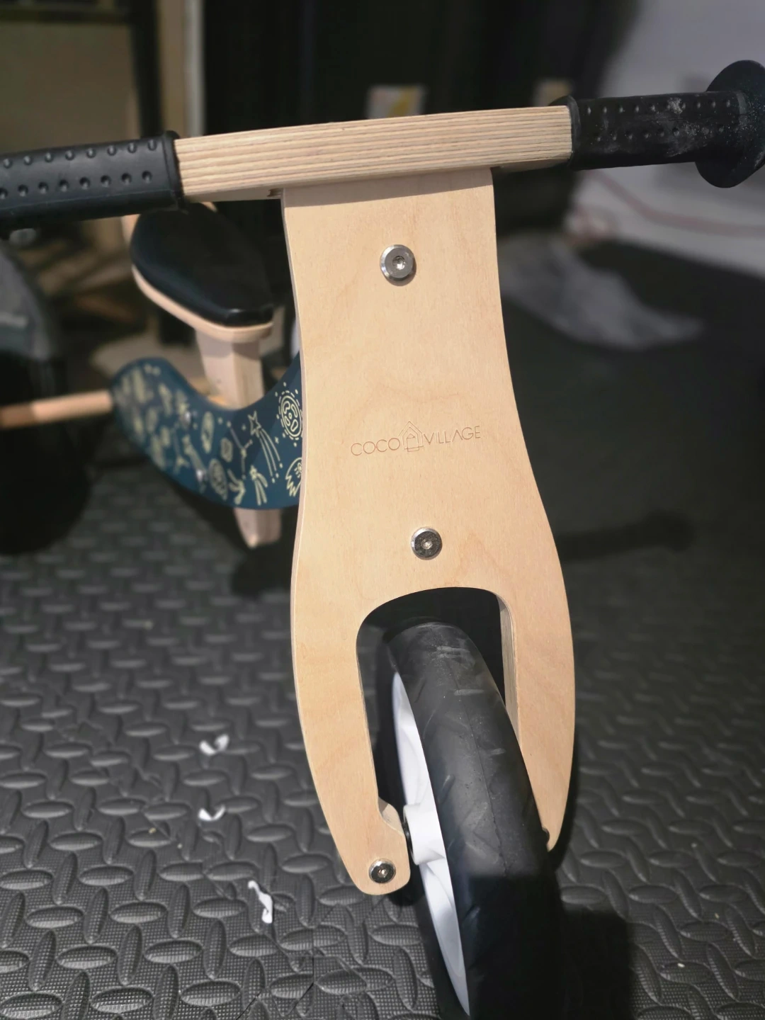 This is a COCO VILLAGE wooden balance bike. It's made with a sturdy wooden frame and has a comfortable seat. The decorative side panel features a fun celestial pattern. This bike is great for toddlers learning to balance!