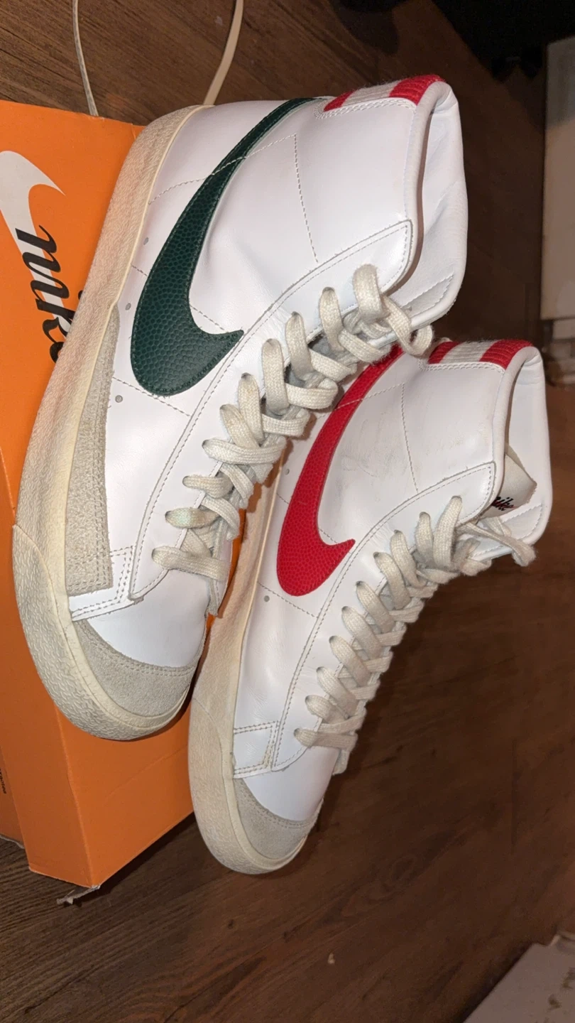 These Nike Blazer Mid '77 Vintage shoes are white with green and red accents. They're a men's size 9.5 (US) and come with the original box.