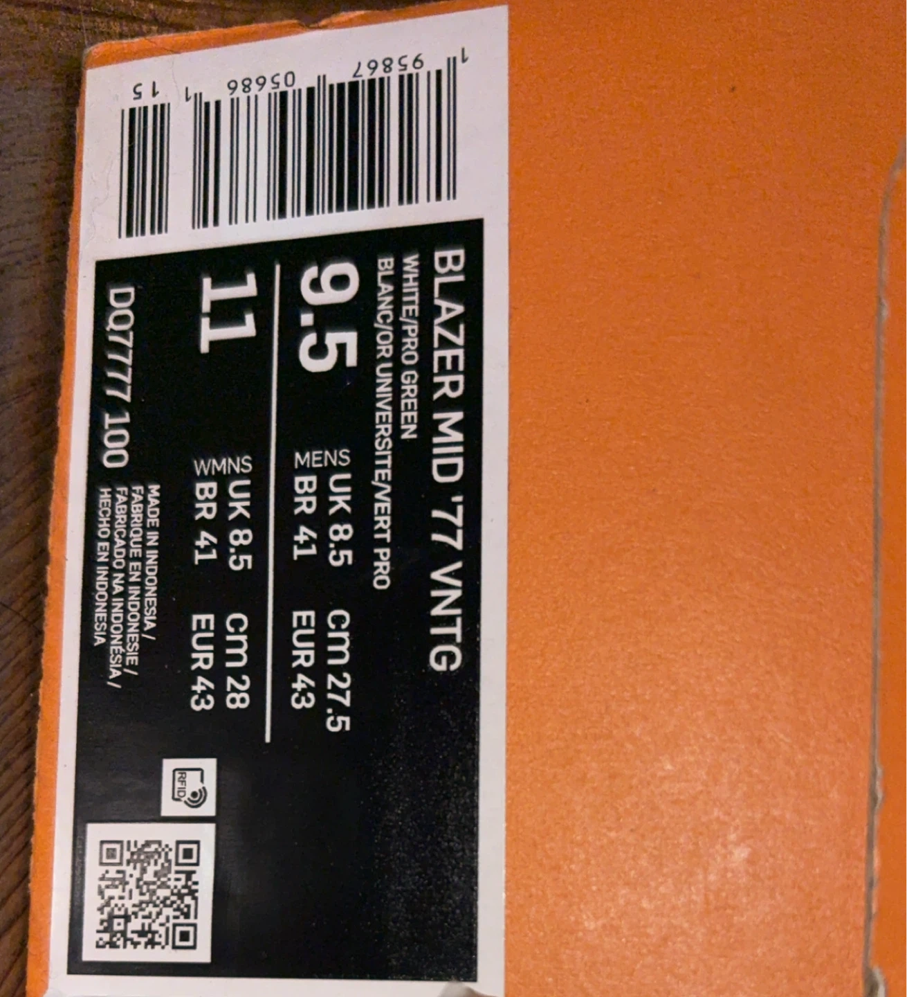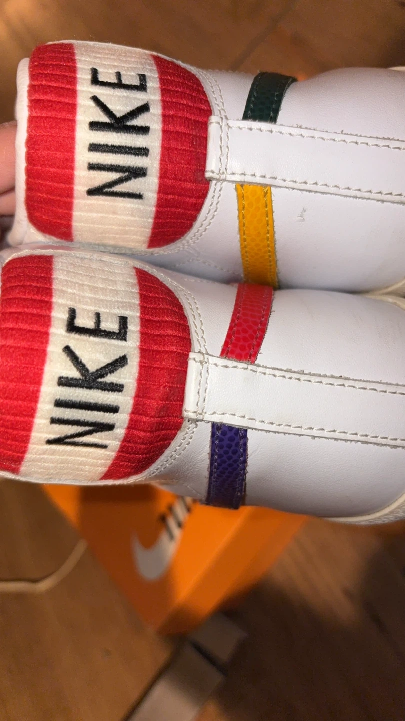 These Nike Blazer Mid '77 Vintage shoes are white with green and red accents. They're a men's size 9.5 (US) and come with the original box.