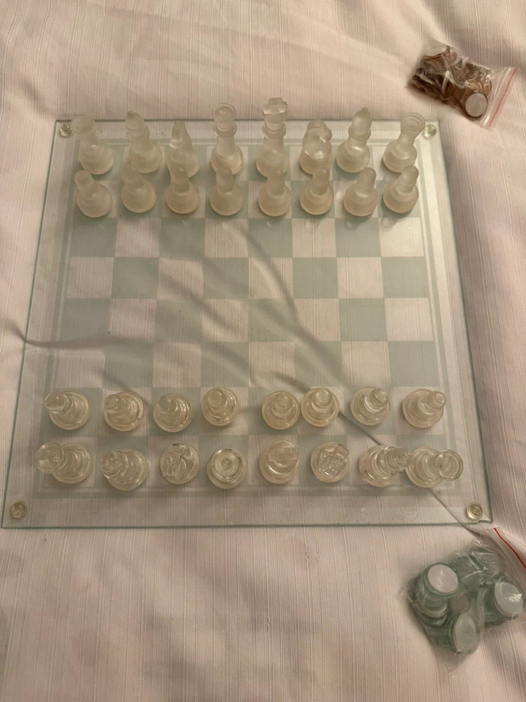 Selling a glass chess set. It comes complete with all the pieces. It also includes the original box! Small chip on board in corner. Also pieces for alternative game of checkers.