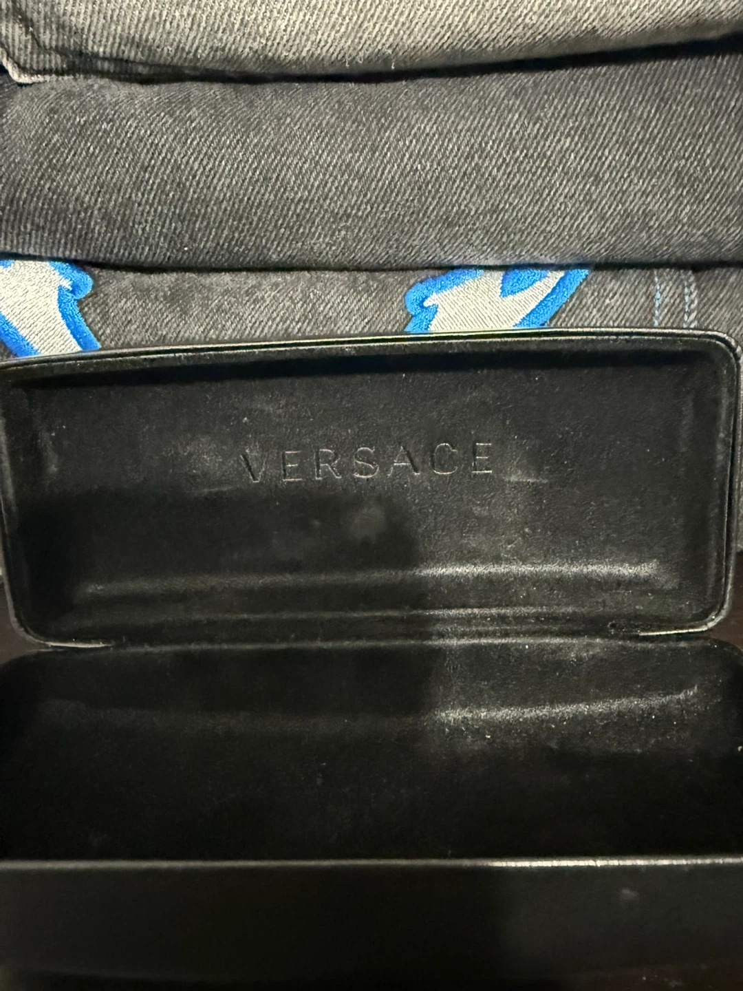 This is a Versace sunglasses case. It's black and features the Versace logo embossed inside and on the exterior. Keep your shades protected in style!