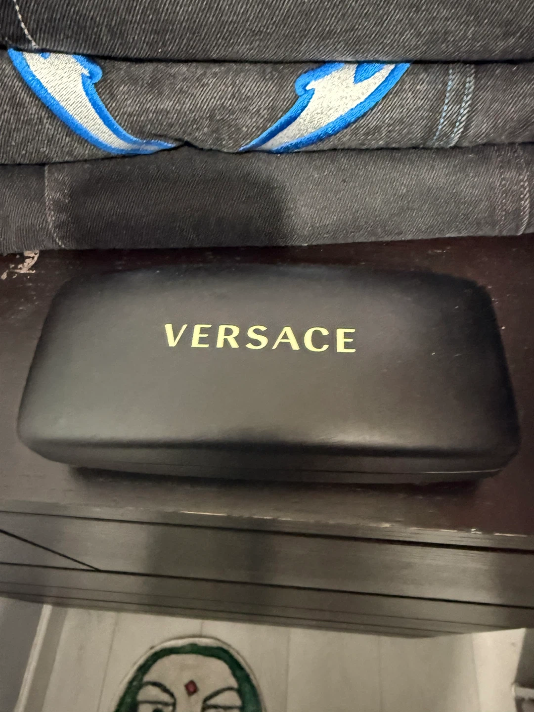 This is a Versace sunglasses case. It's black and features the Versace logo embossed inside and on the exterior. Keep your shades protected in style!