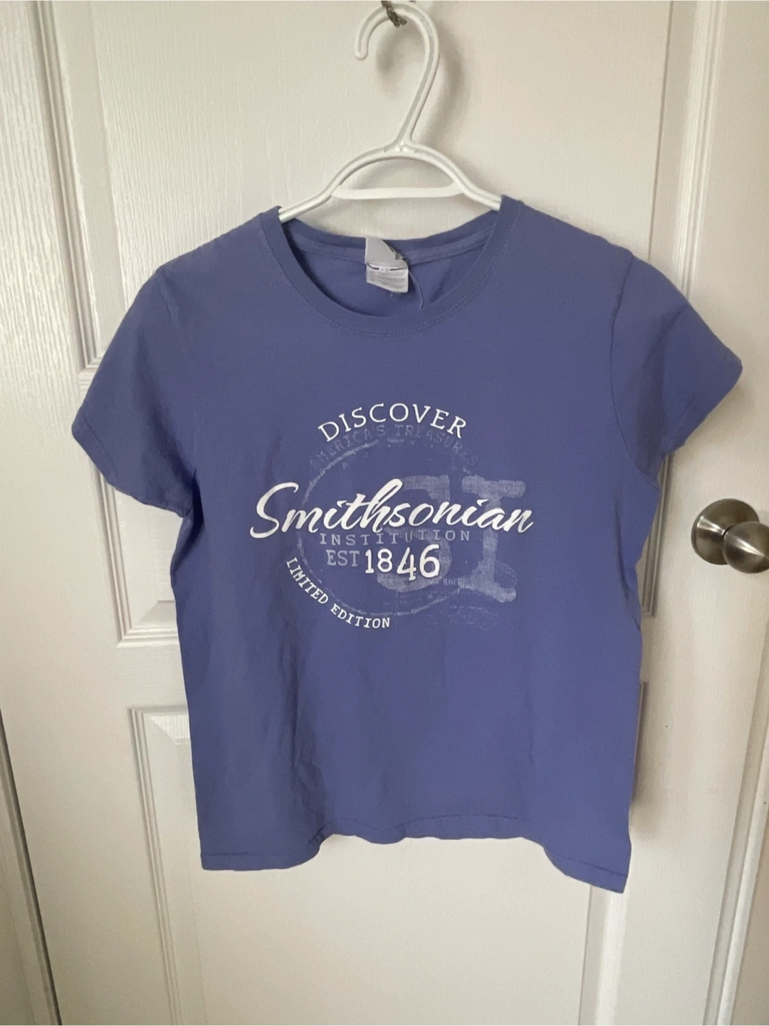 This is a blue Smithsonian Institution t-shirt. It's a limited edition item with "Discover America's Treasures" printed on it. It's perfect for anyone who loves history and museums!