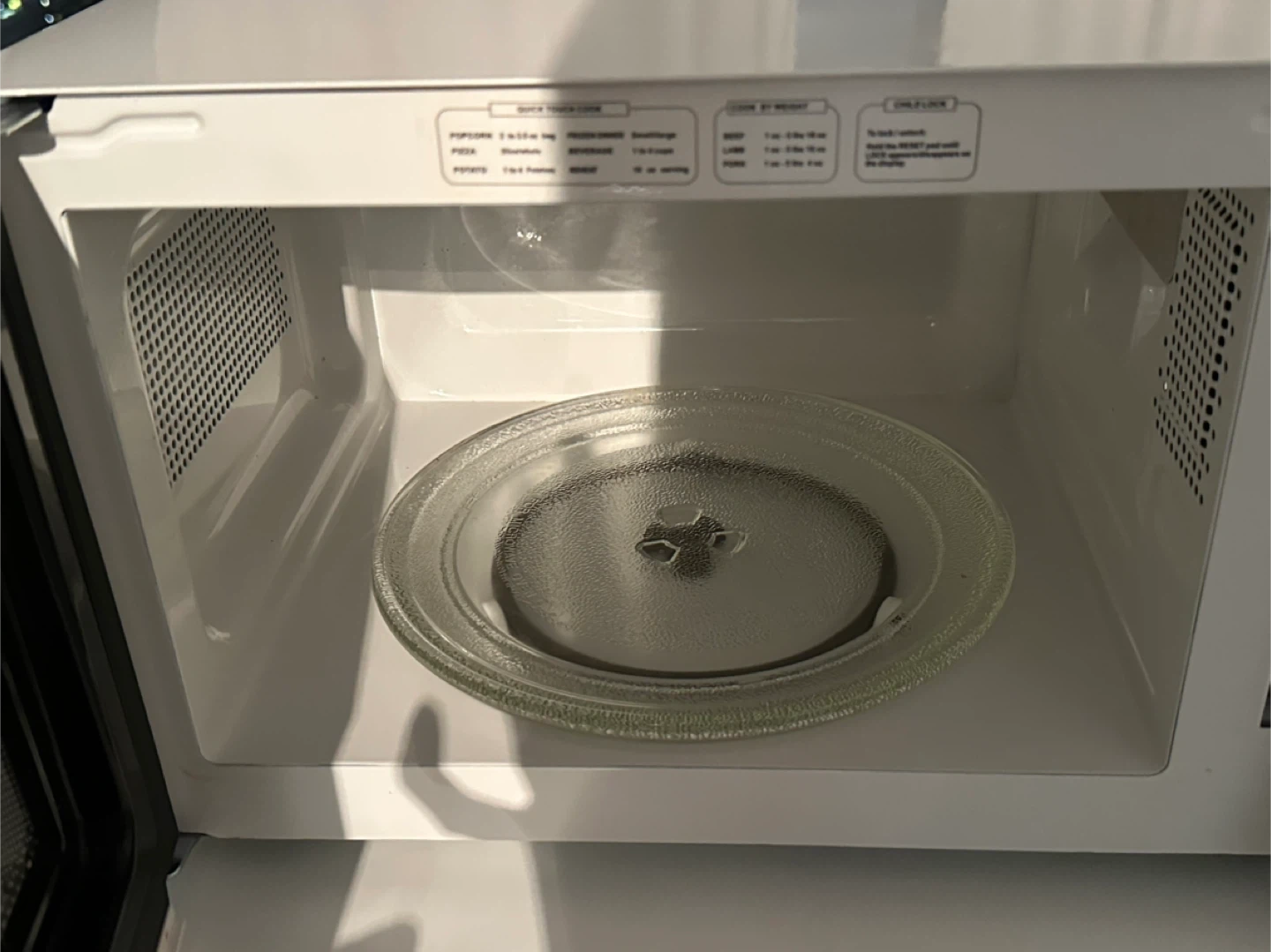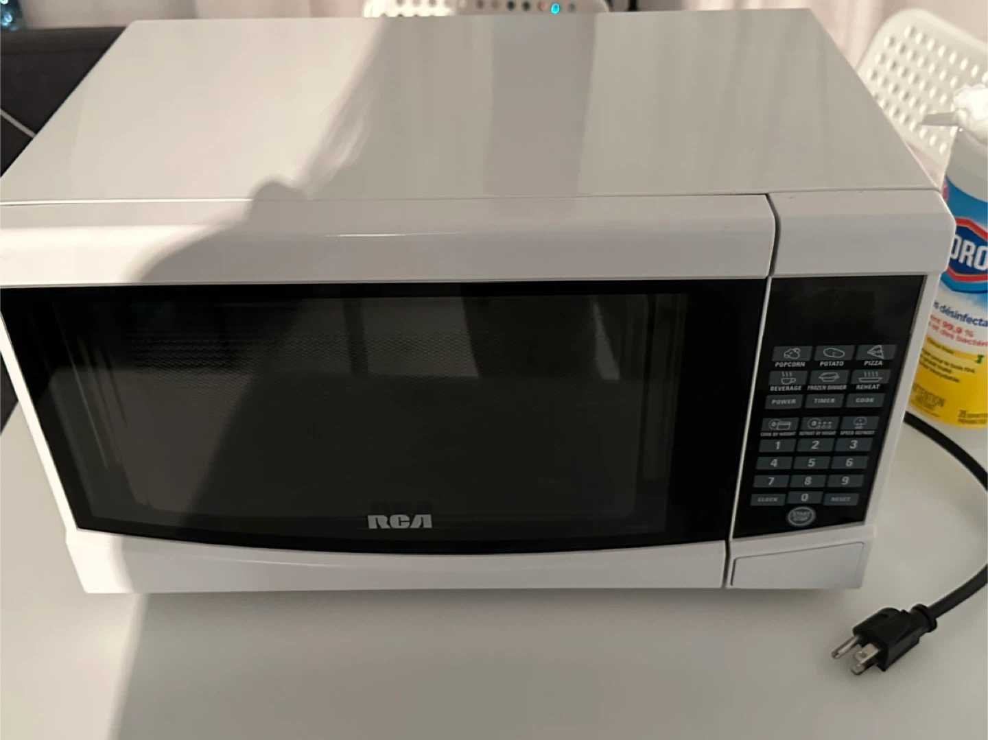 This RCA microwave is a handy kitchen appliance. It features quick cook buttons for common items like popcorn and pizza. The digital display shows the time and cooking settings.