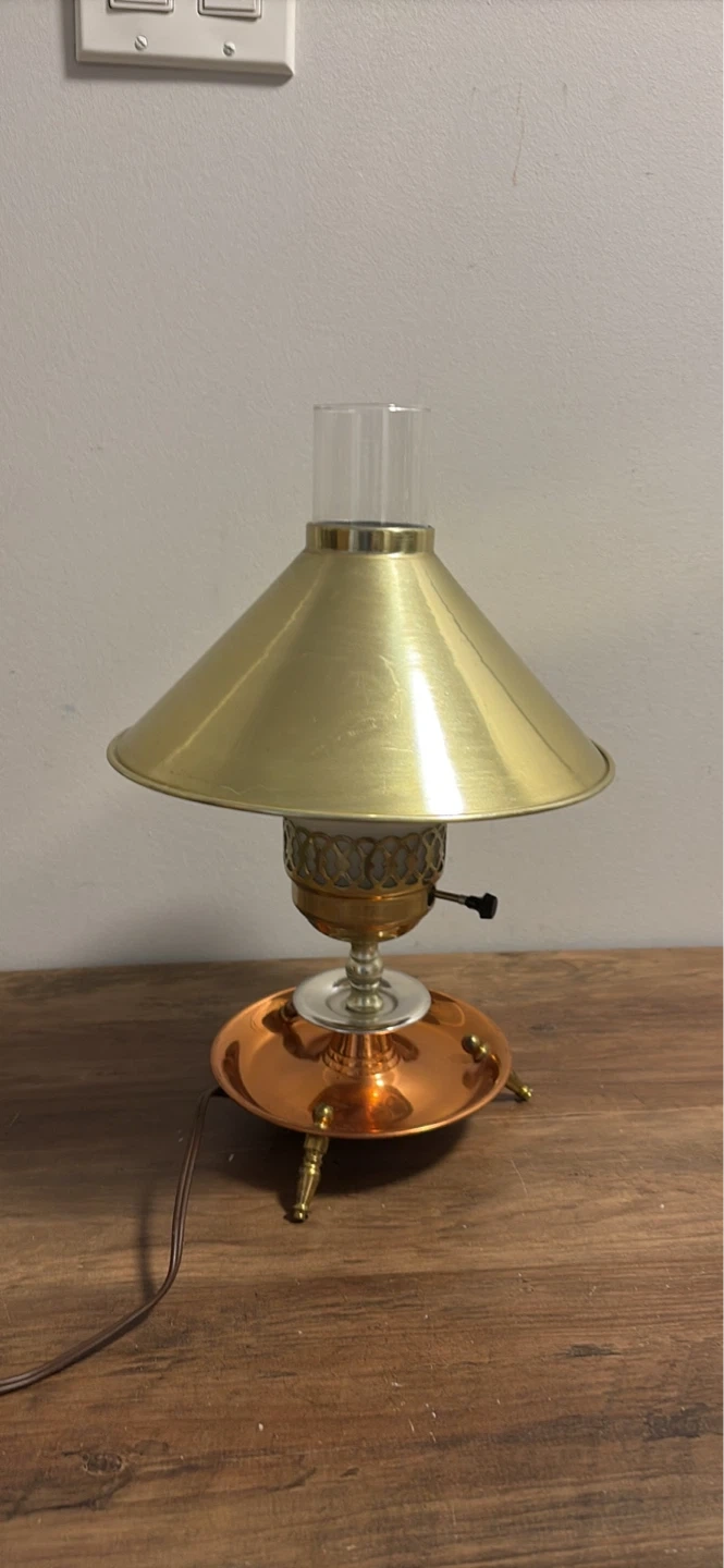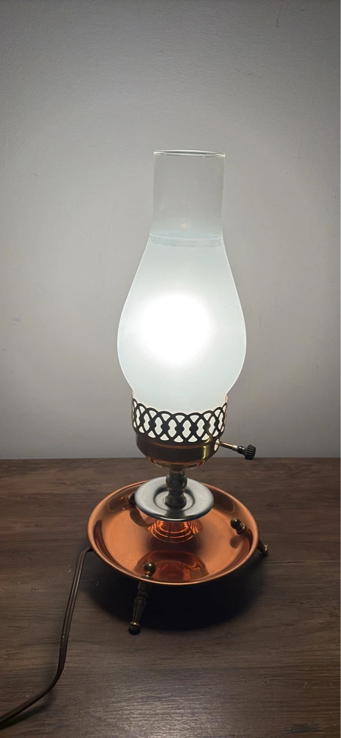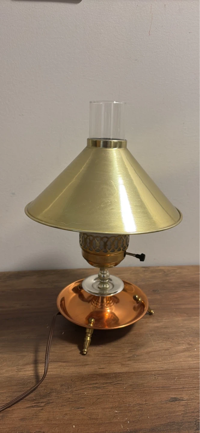 This vintage table lamp features a brass-finished conical shade and a copper base with decorative legs. It has a clear glass chimney with a frosted glass insert.It's a charming piece for any room!