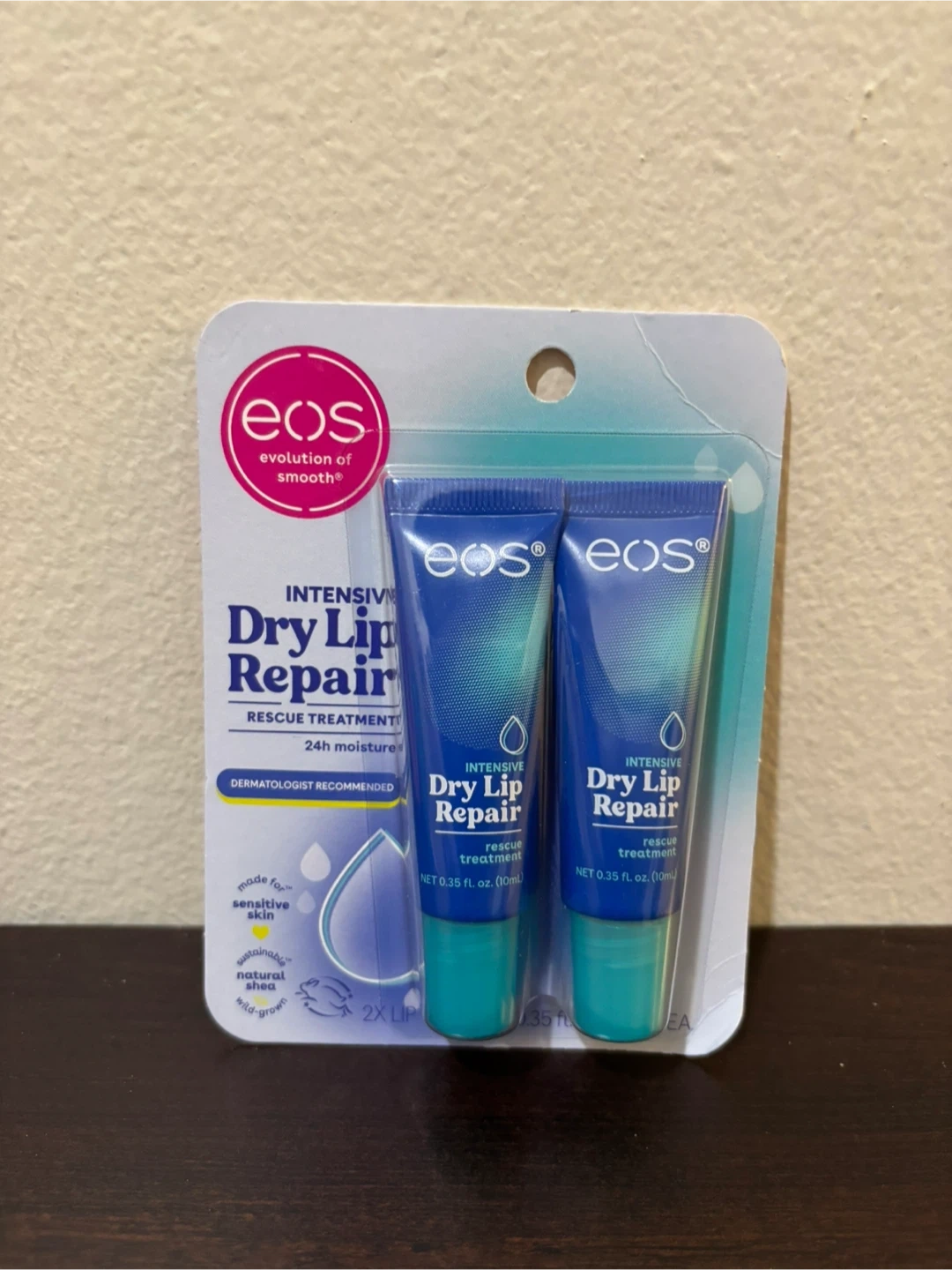 This pack includes two EOS Intensive Dry Lip Repair lip balms. Each balm is 0.35 fl. oz. (10ml) and provides 24-hour moisture. It's made for sensitive skin with natural, wild-grown shea.