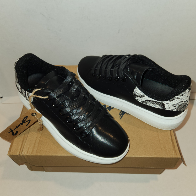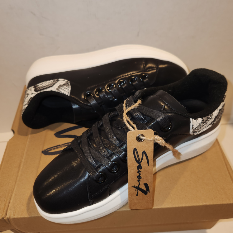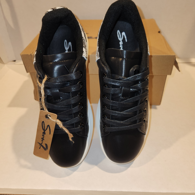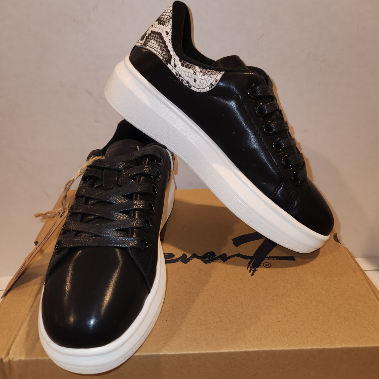 Selling a pair of Women's Seven7 Miki black sneakers. They have a white sole and a snakeskin pattern on the back. Comes with the original box! Brand new