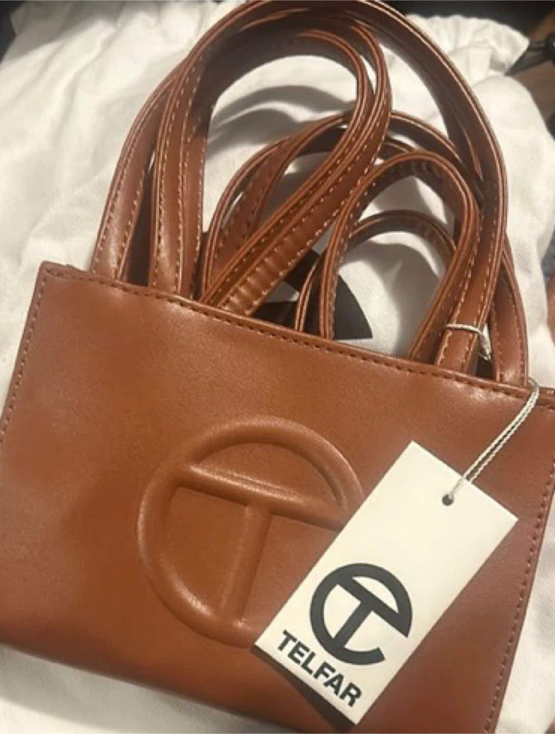 This is a small Telfar shopper bag. It's made of vegan leather. This bag's iconic design makes it a statement piece!