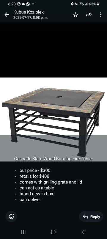 Cascade Slate Wood Burning Fire Table, brand new in box. It comes with a grilling grate and lid and can also act as a table. This fire table is great for backyard gatherings on cooler evenings!