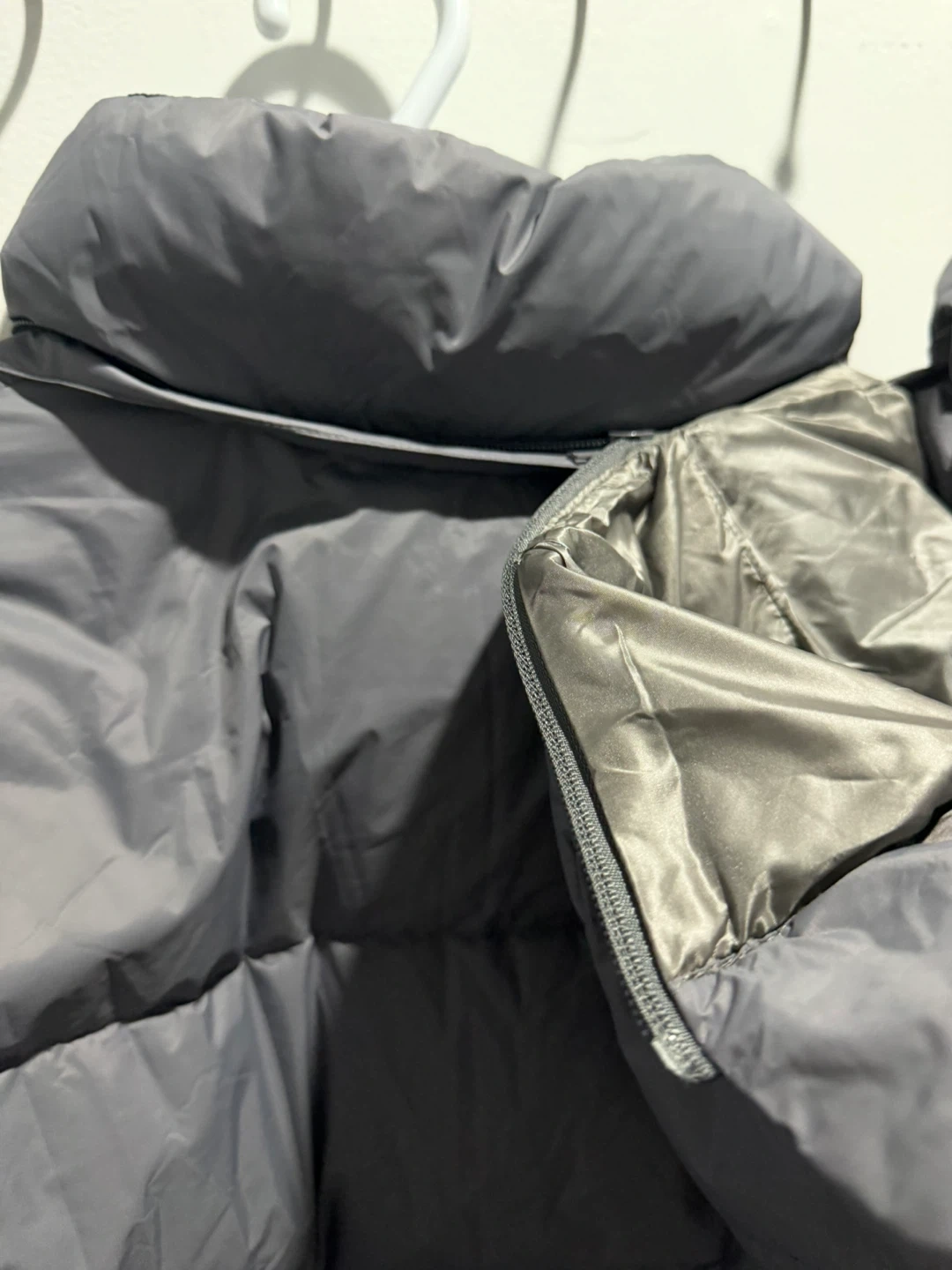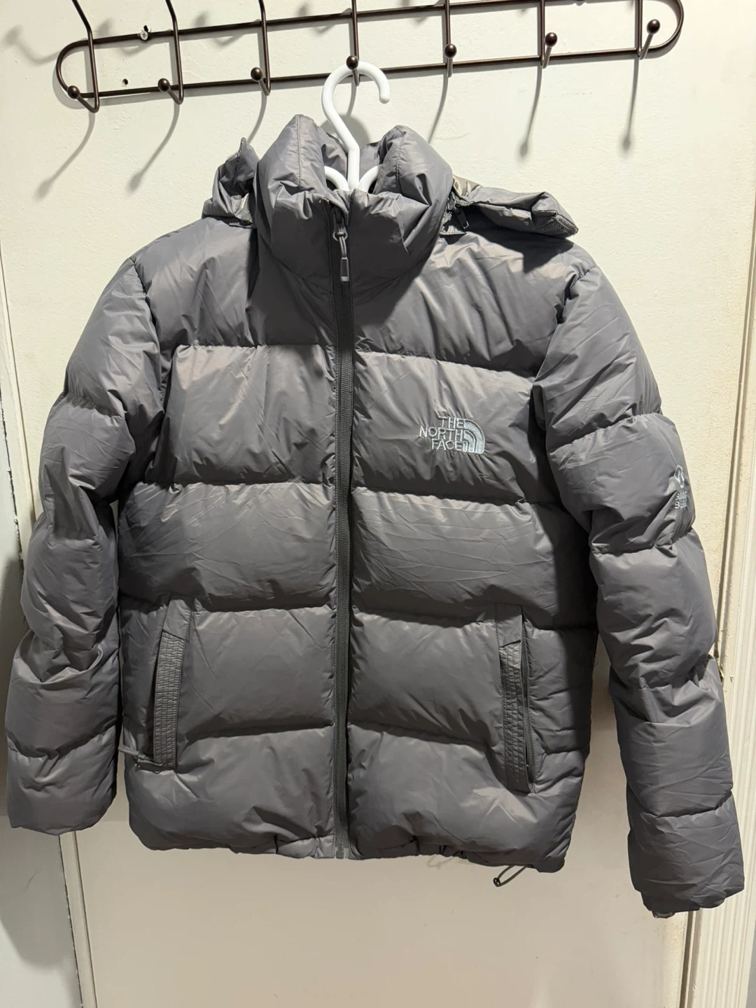 This is a grey puffer jacket from The North Face, Summit Series. It's a size medium and features a full-zip closure and hood. It's designed for warmth and protection.