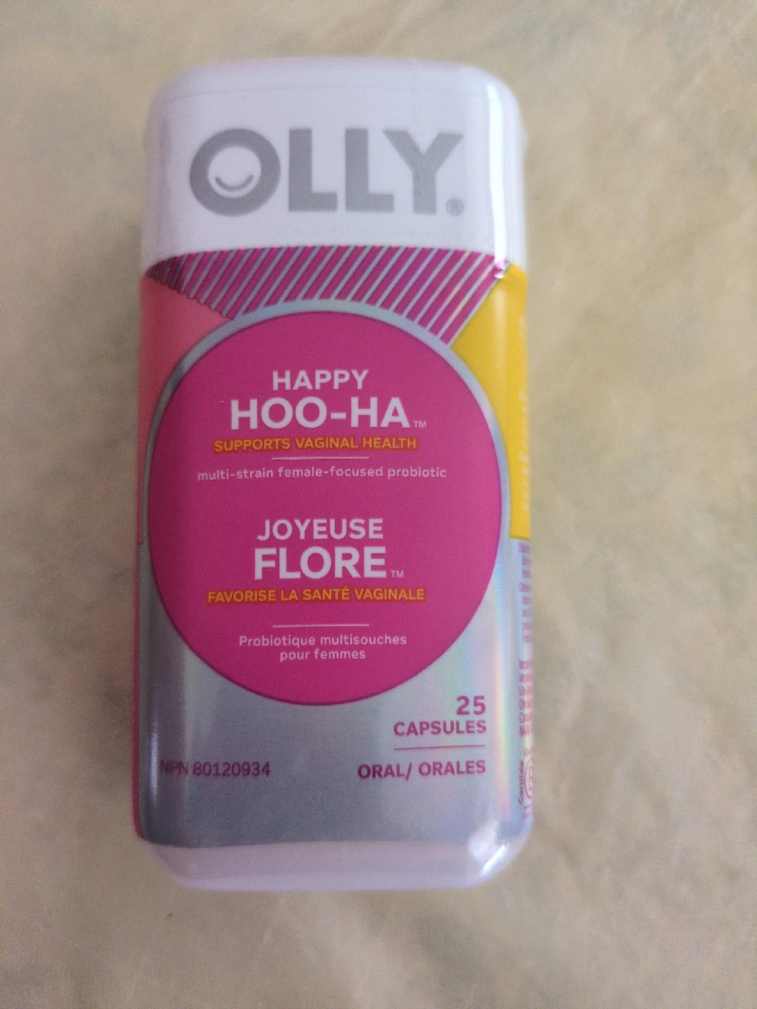 Selling a bottle of Olly Happy Hoo-Ha probiotics! This contains 25 capsules of a multi-strain female-focused probiotic that supports vaginal health. It also has a French translation: Joyeuse Flore, which promotes vaginal health too