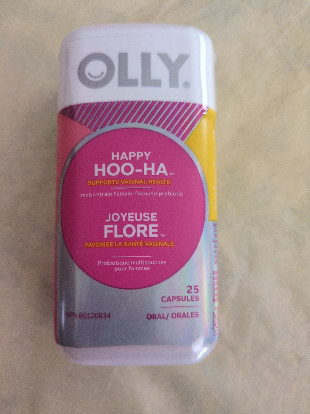 Selling a bottle of Olly Happy Hoo-Ha probiotics! This contains 25 capsules of a multi-strain female-focused probiotic that supports vaginal health. It also has a French translation: Joyeuse Flore, which promotes vaginal health too
