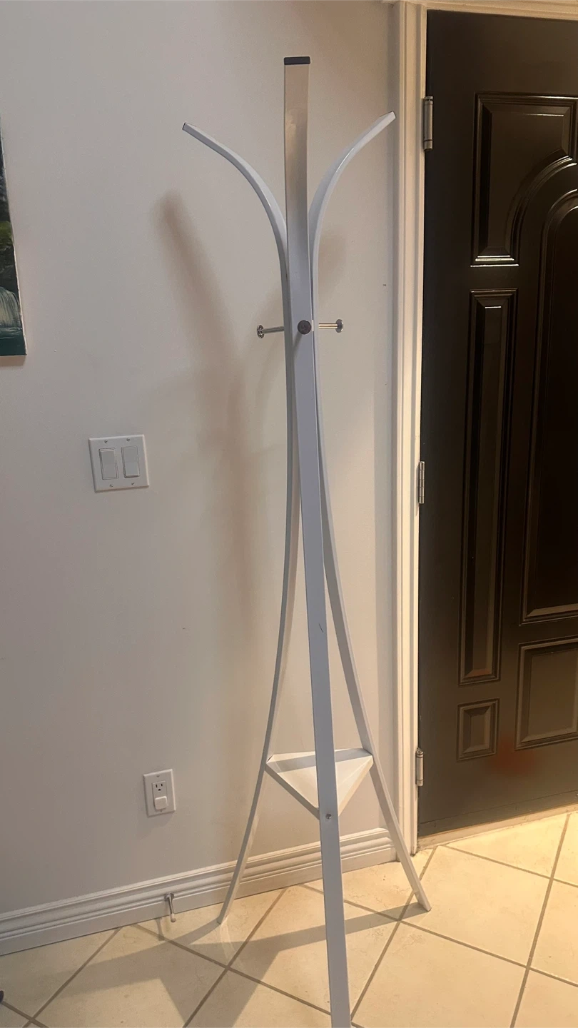 A modern white coat rack designed to hold your jackets and accessories. It features multiple hooks and a convenient shelf at the bottom for additional storage. This rack's sleek design makes it a practical addition to any entryway.