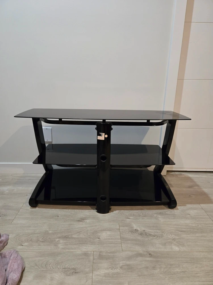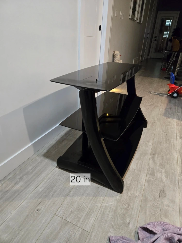 Selling a black glass TV stand! It's in great shape and ready for a new home. The dimensions are 40 inches wide and 24 inches tall. The shelves are 20 inches apart.