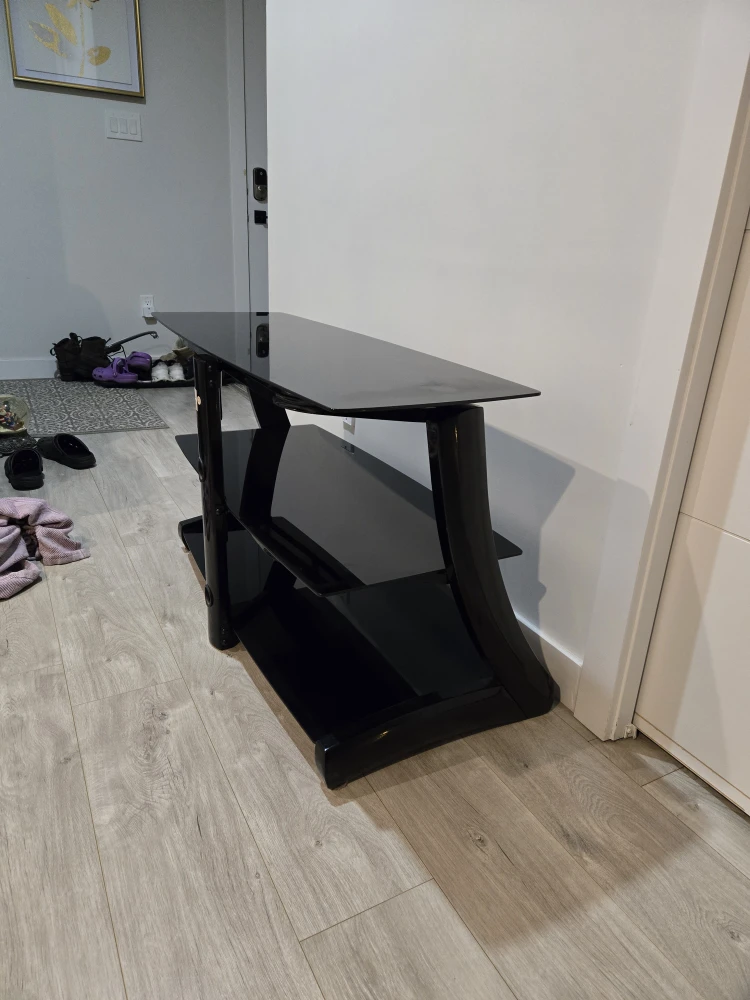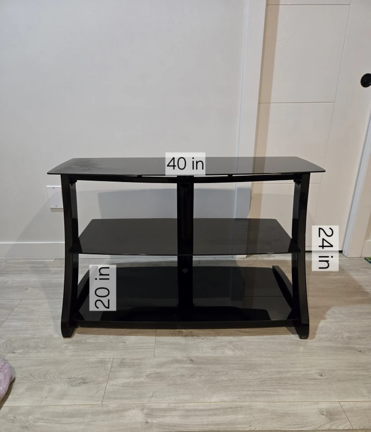 Selling a black glass TV stand! It's in great shape and ready for a new home. The dimensions are 40 inches wide and 24 inches tall. The shelves are 20 inches apart.