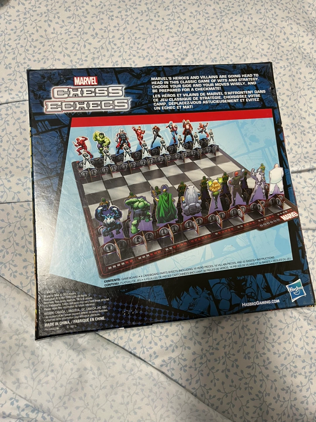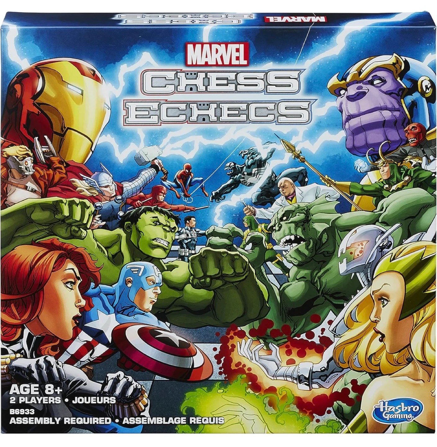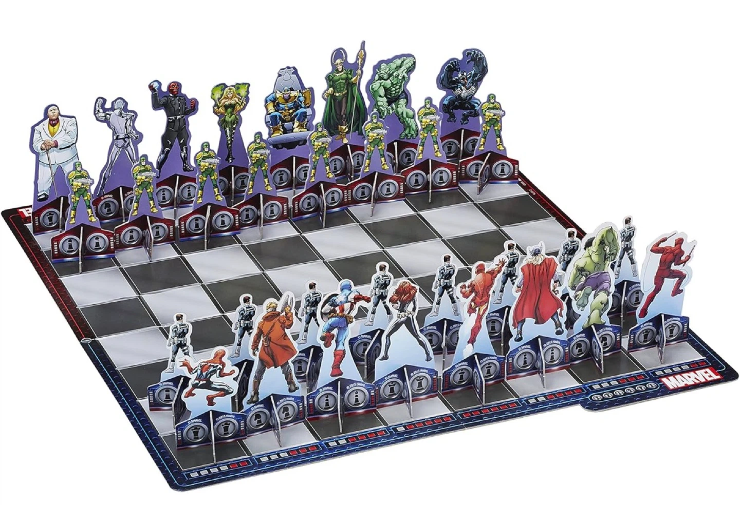 This is the Marvel Chess Echecs game featuring heroes and villains. It includes a game board, 16 hero pieces, 16 villain pieces, and 32 bases. Assembly is required for the game. Great for Marvel fans and chess players alike!