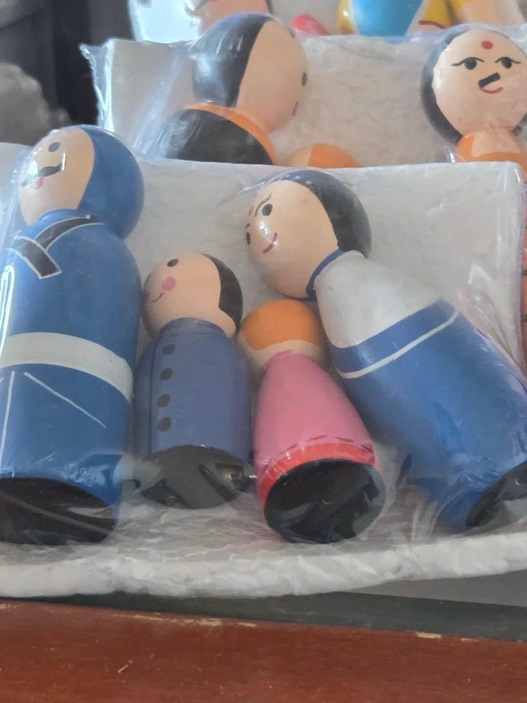 This is a set of wooden peg dolls representing a family. They are hand-painted with traditional clothing. These would make a lovely addition to a child's play collection or a decorative display piece.