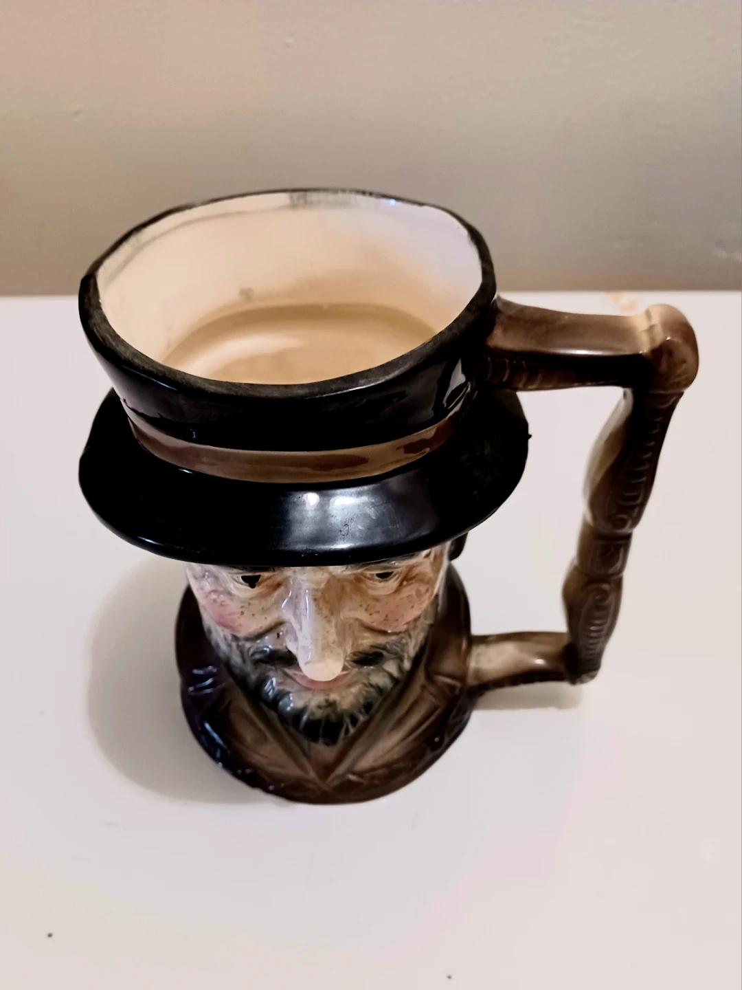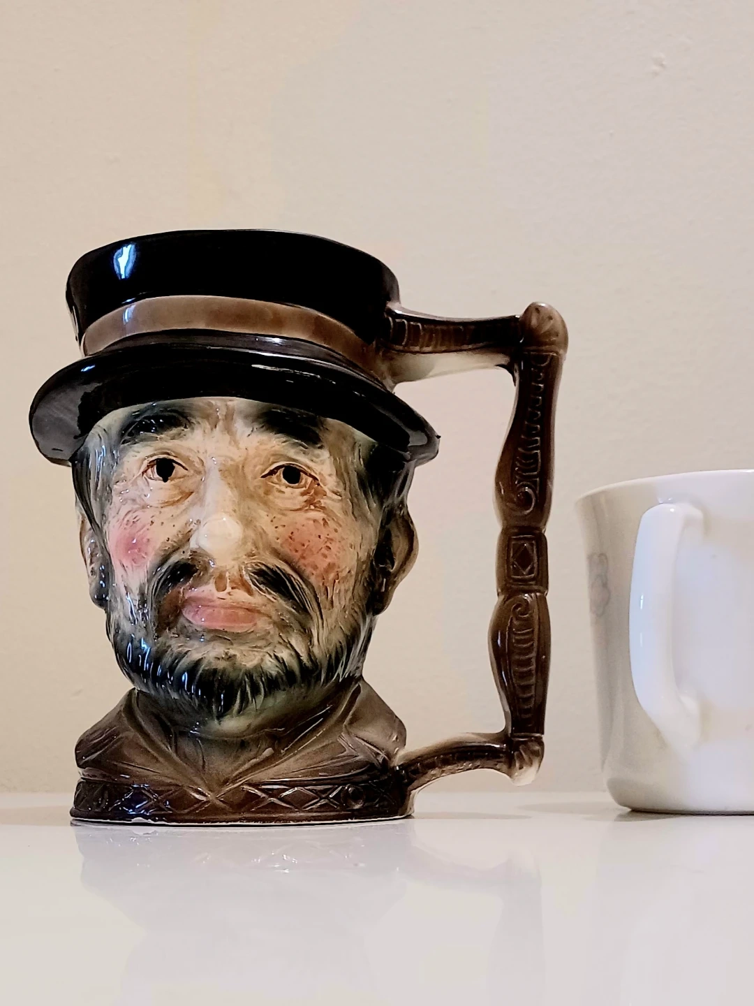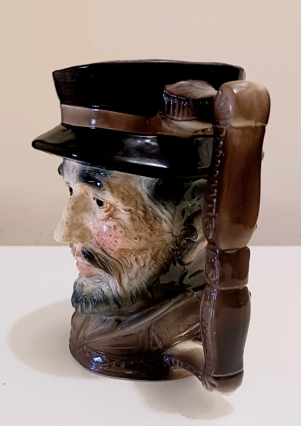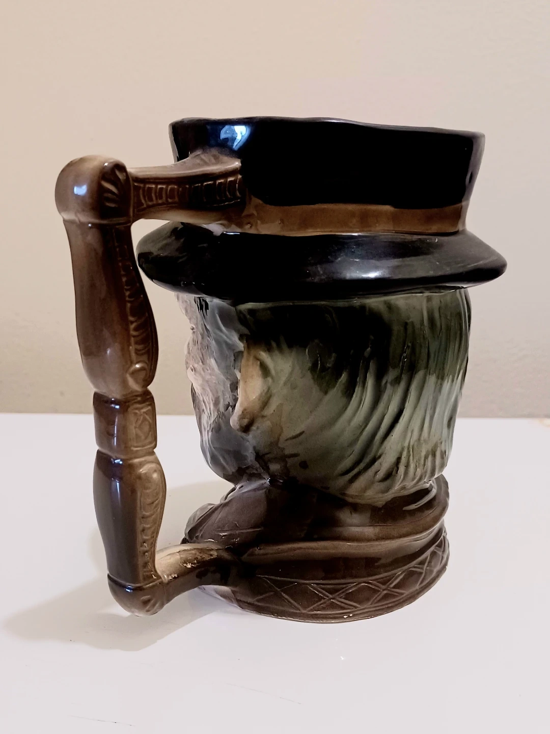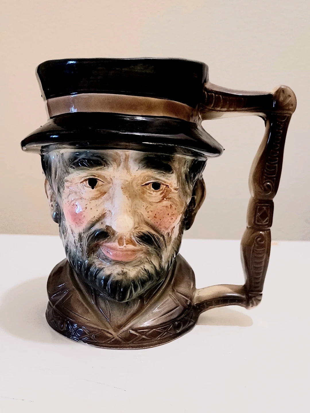 Design: The mug is modeled as the head of a bearded man with a ruddy complexion, wearing a dark wide-brimmed hat. It features a distinctive squared-off or "twig-style" handle.