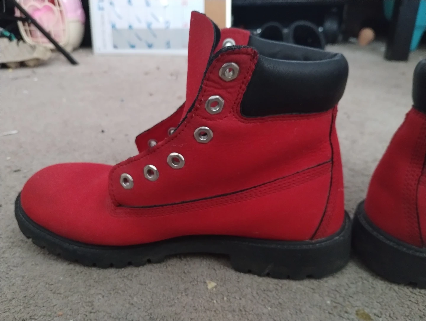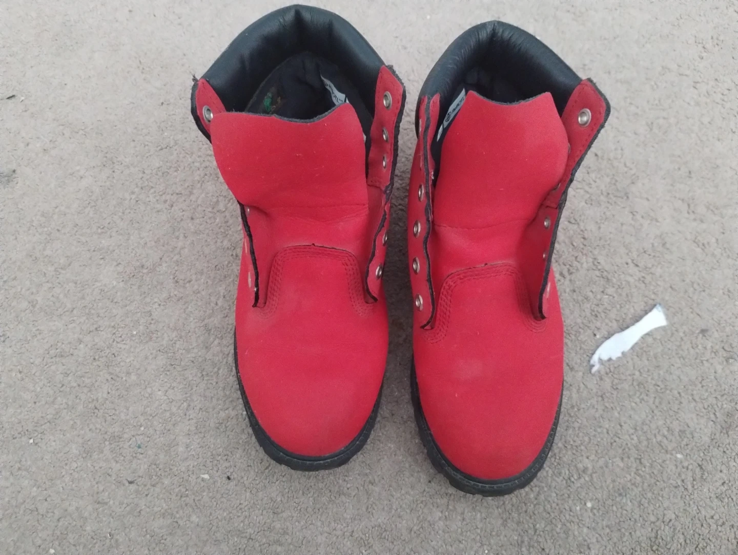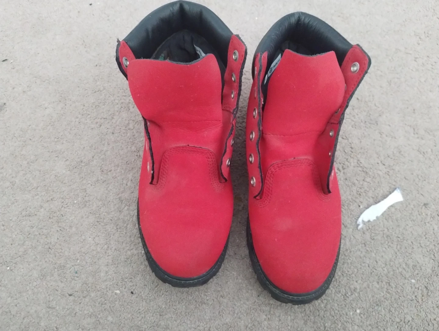 These are red Timberland boots with black trim. They're made of suede material and are still in great condition, Size 6 and barely used