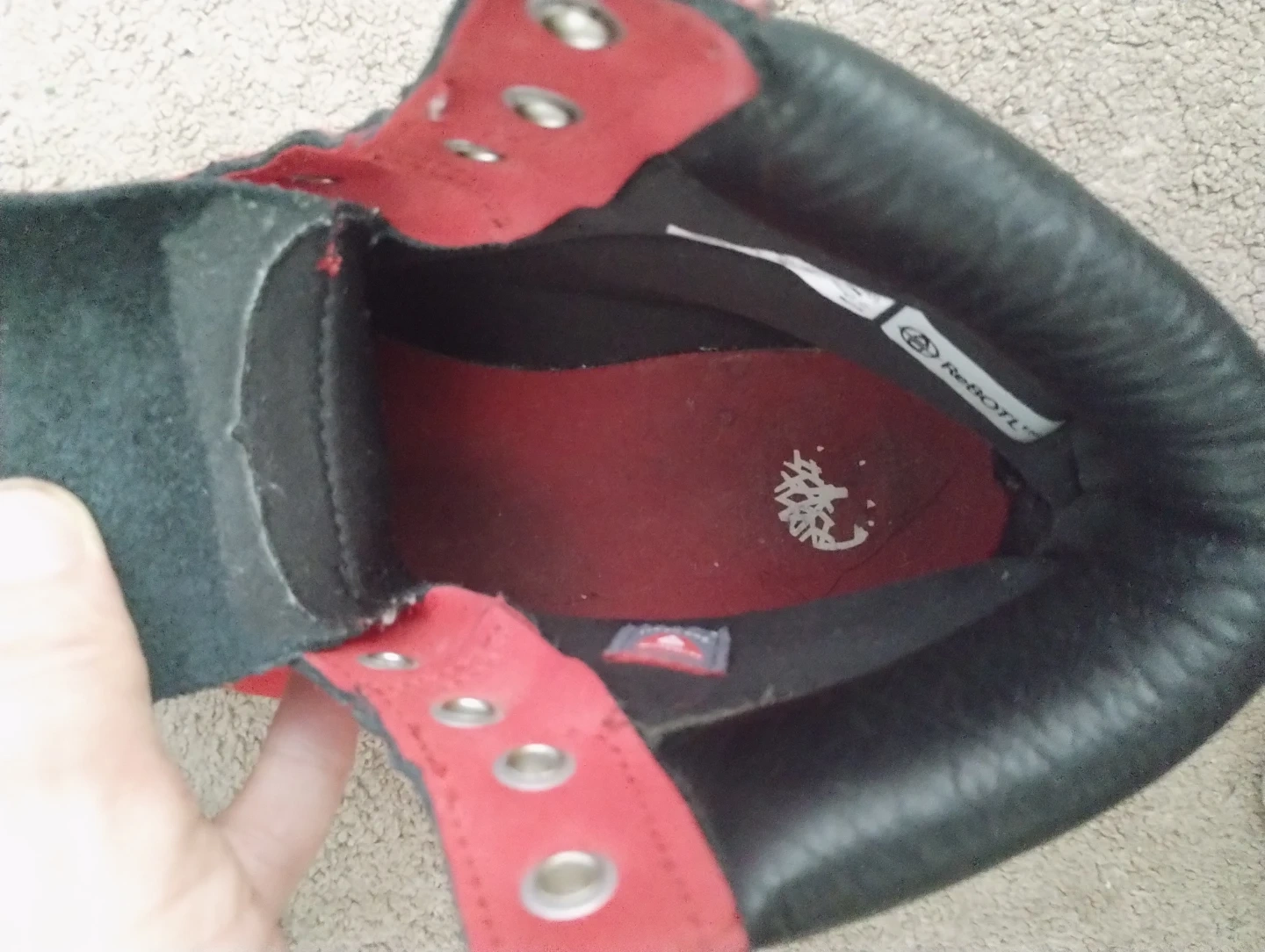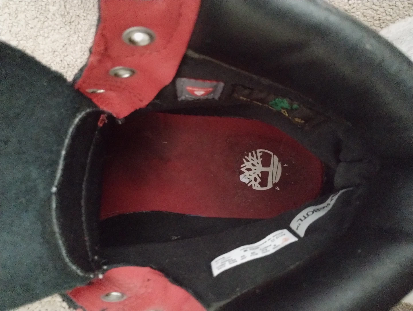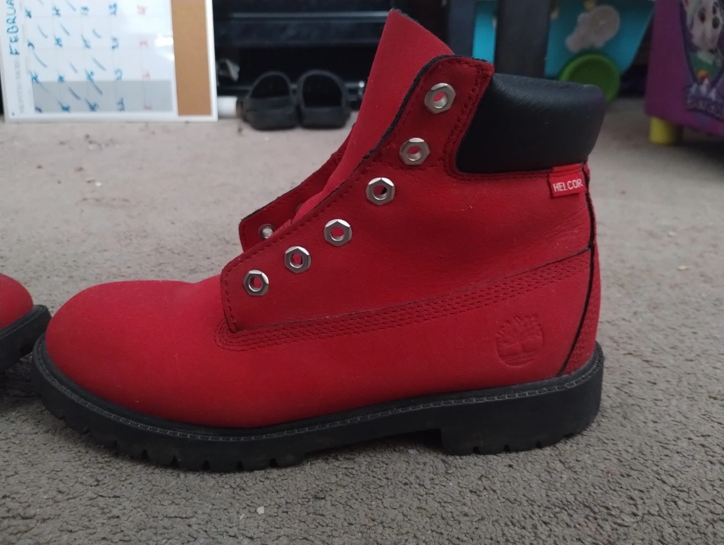 These are red Timberland boots with black trim. They're made of suede material and are still in great condition, Size 6 and barely used