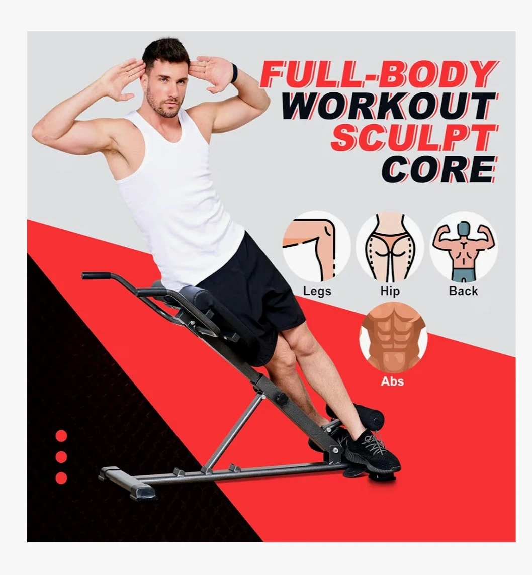 This Roman chair offers adjustable height with 7 levels and 3 different angles for various exercises. It features thick soft cushions and high-density foam foot pads for comfort. The design includes slip-resistant handles and non-slip foot covers for stability. It's also a foldable design with adjustable intensity, all-in-one for fat loss and body sculpting.