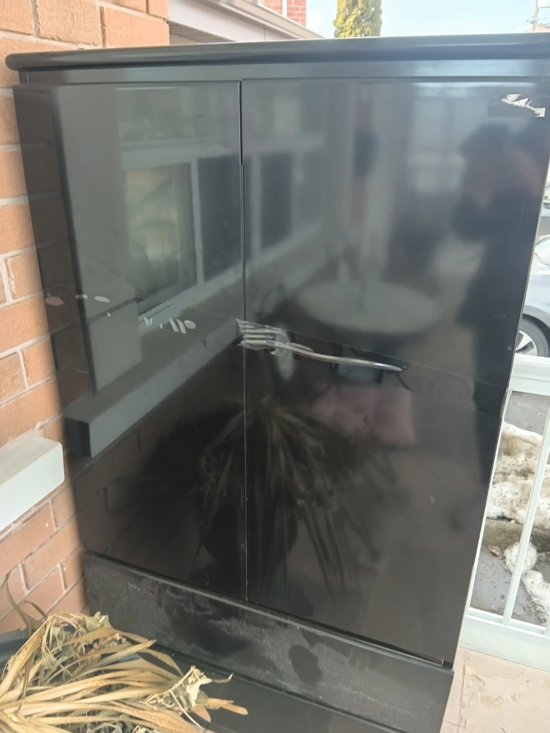 Black armoire with two doors. It's a tall, narrow unit. The finish is glossy and reflective. This cabinet offers storage space.in excellent shape asking 100