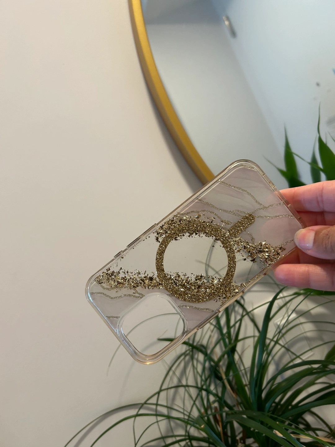 Selling a cute phone case with gold glitter accents! It has a MagSafe ring, so it's compatible with MagSafe chargers and accessories. The case is clear with gold glitter details. It's in great condition and ready for a new phone!