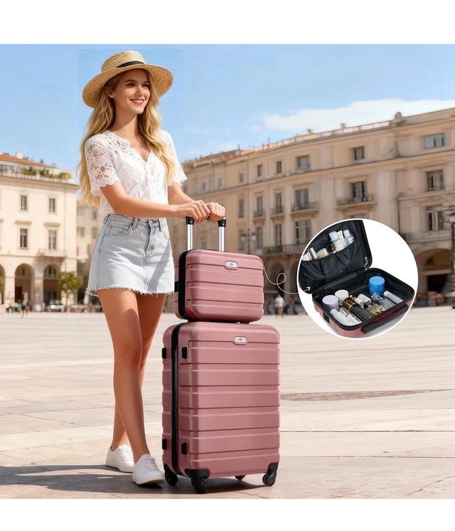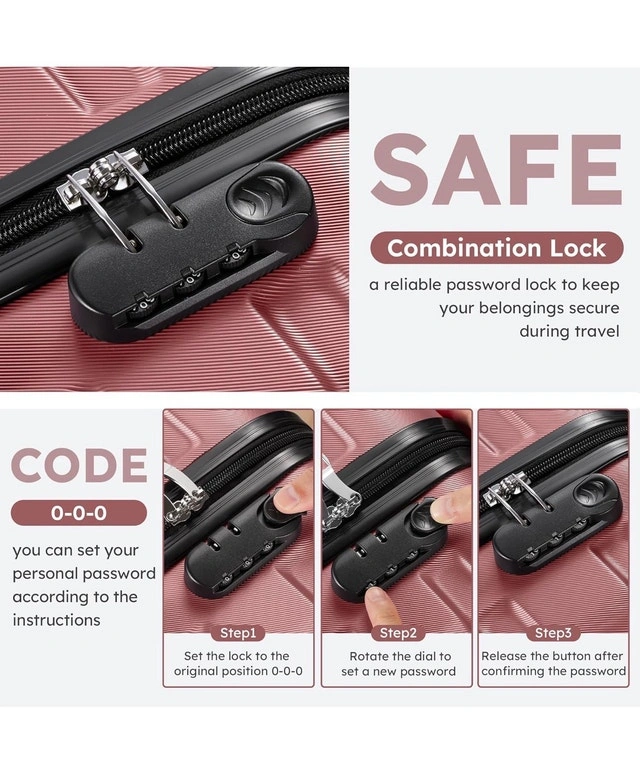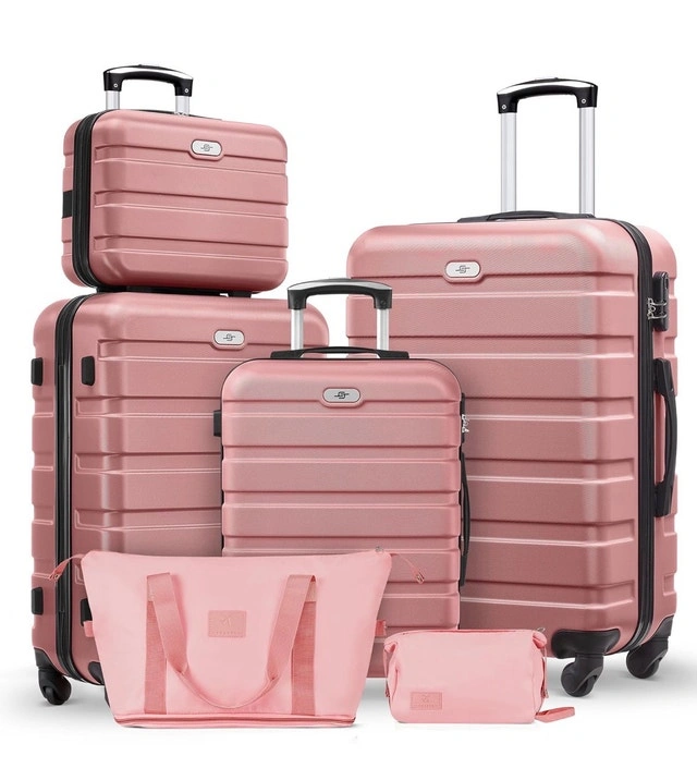 This is a 6-piece SWISSGEAR luggage set. It includes a 13-inch cosmetic suitcase, a 20-inch carry-on, a 24-inch and a 28-inch checked suitcase, an expandable duffle bag, and a toiletry bag. The luggage is hard-sided ABS with spinner wheels and telescopic handles, featuring combination locks. The suitcases nest for easy storage and have multiple compartments for organized packing. The set is perfect for getaways, vacations, or business trips. Features include durable construction, 360-degree spinner wheels, telescopic handles, multiple compartments, and an elegant rose gold finish. Similar sets sell for around $250 on Kijiji. This set is new. Cash and cashless payments are accepted. For Sale By: Owner.