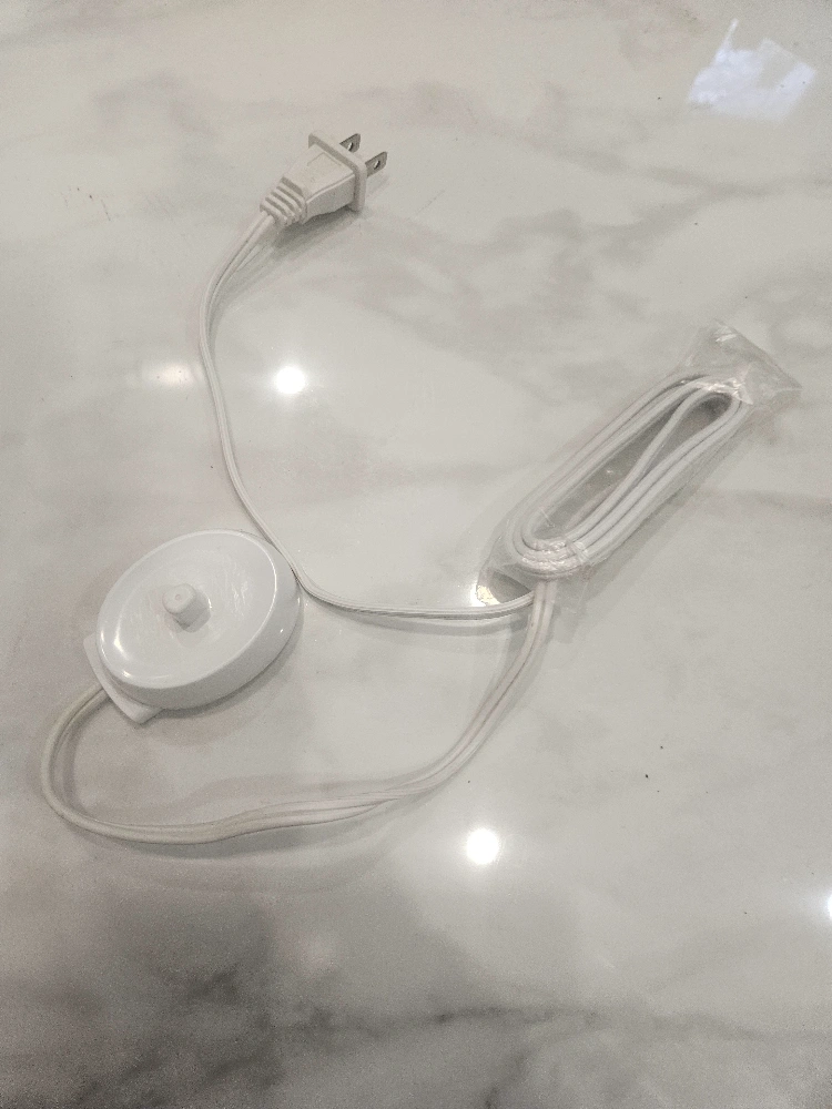 White electric toothbrush charger base with a standard two-prong plug. The cord is approximately 3 feet long. Charger base only.