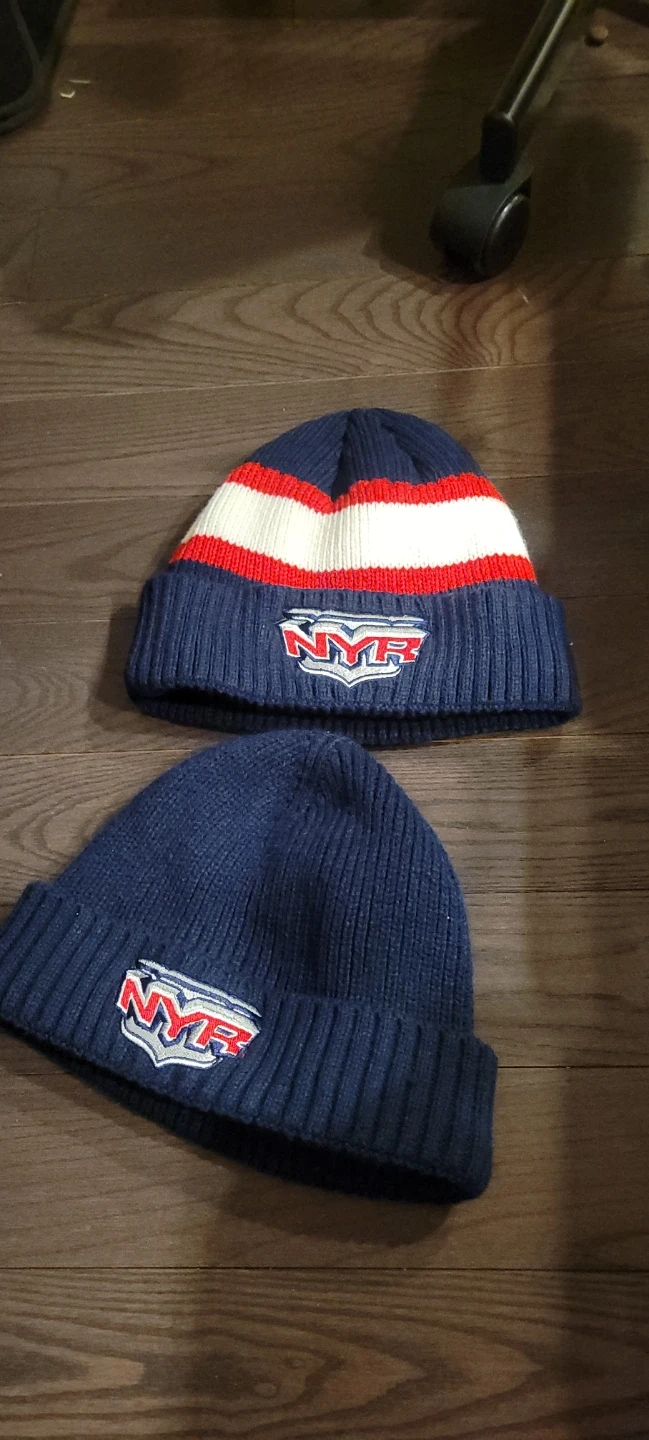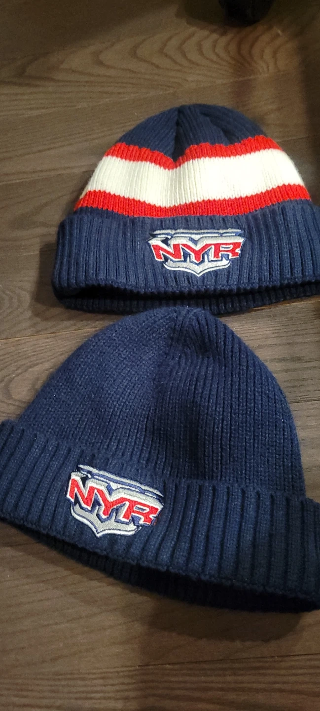 Two navy blue knit toques with the NYR logo. One toque features red and white stripes near the cuff. Keep warm this winter!