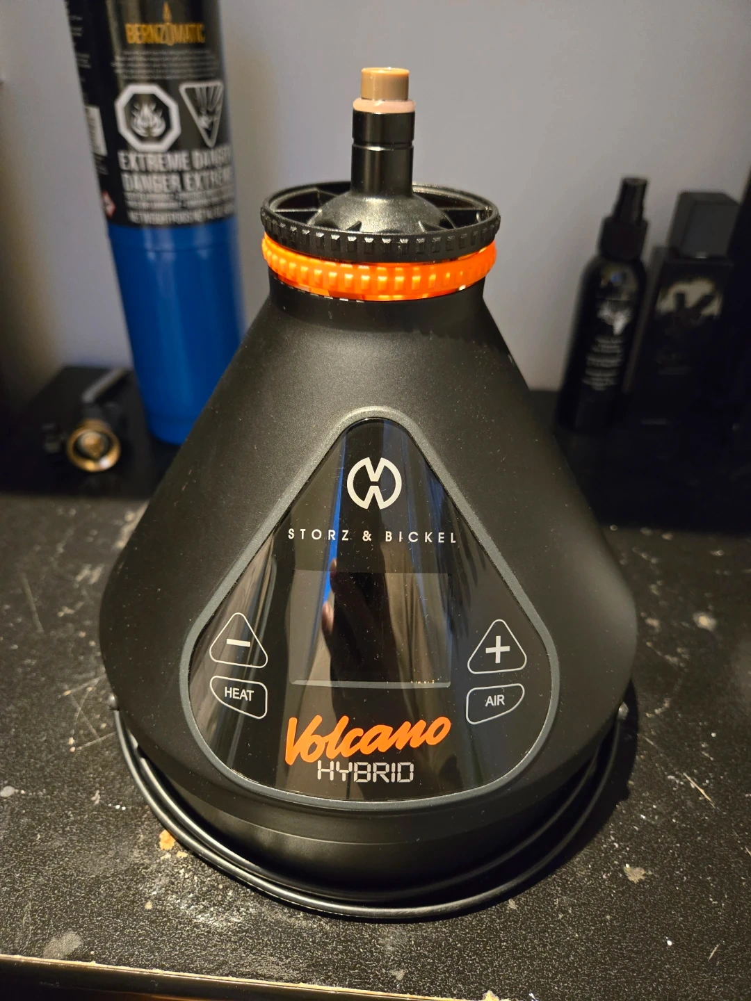 This is the Storz & Bickel Volcano Hybrid onyx vaporizer. It features digital temperature control and a LED display. It's made in Germany. Induction and convention heaters.