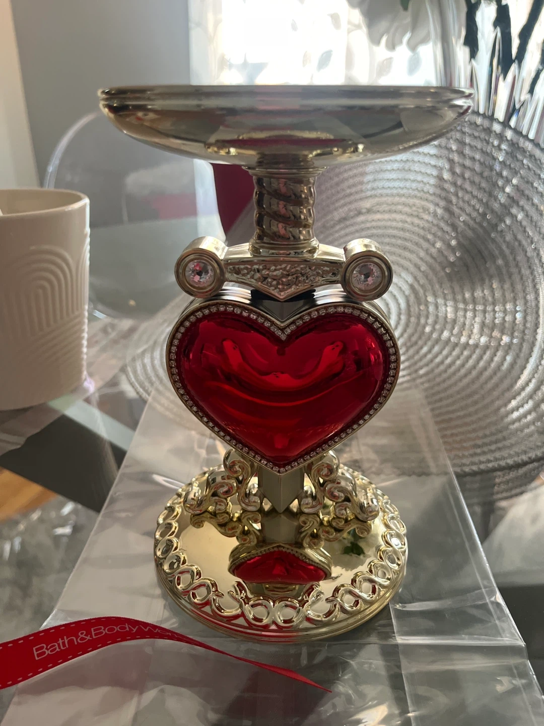 This Bath & Body Works candle holder features a shiny gold finish with a decorative red heart accent. It's designed to hold a standard-sized pillar candle. The ornate base adds a touch of elegance to any room. It's a lovely piece for home decor!
